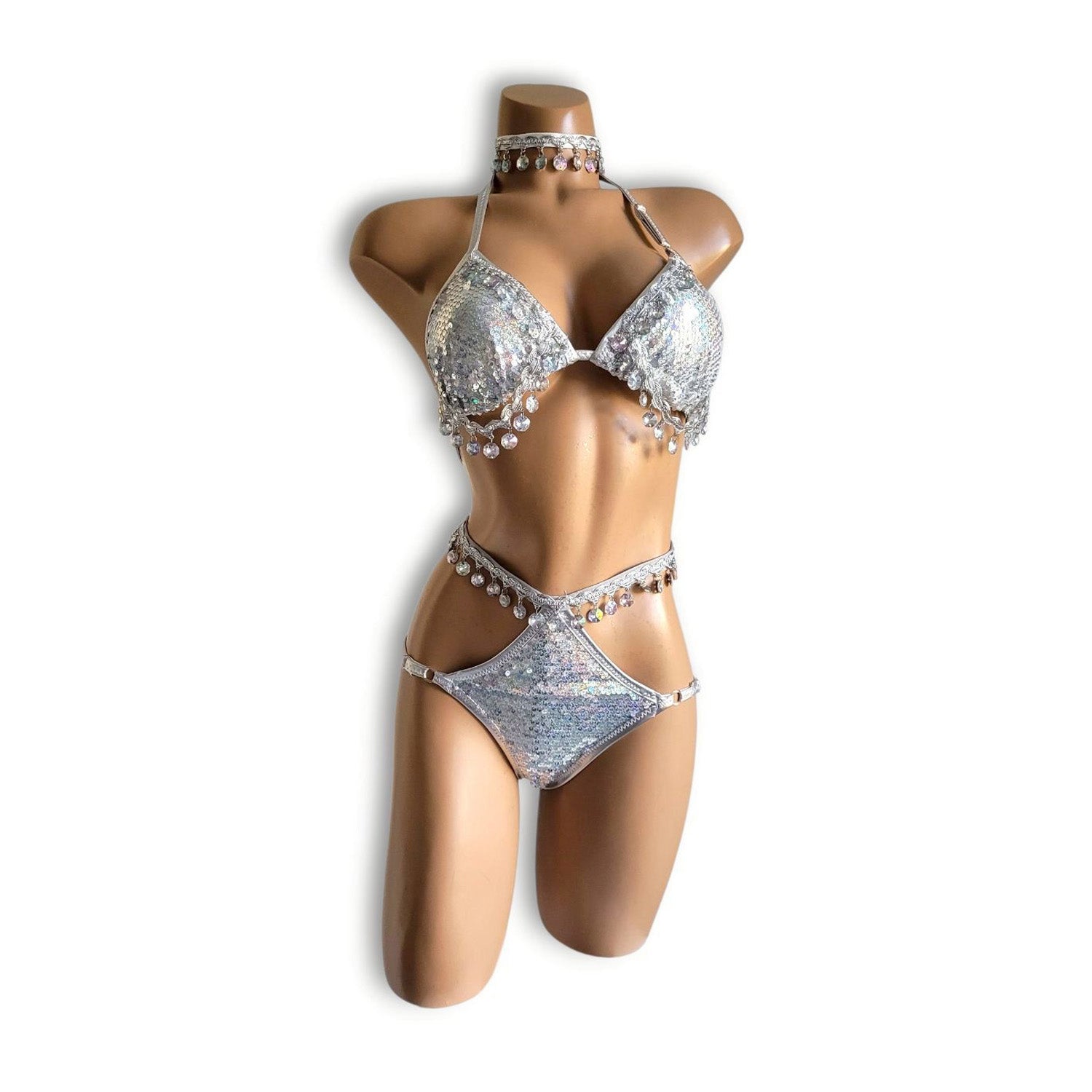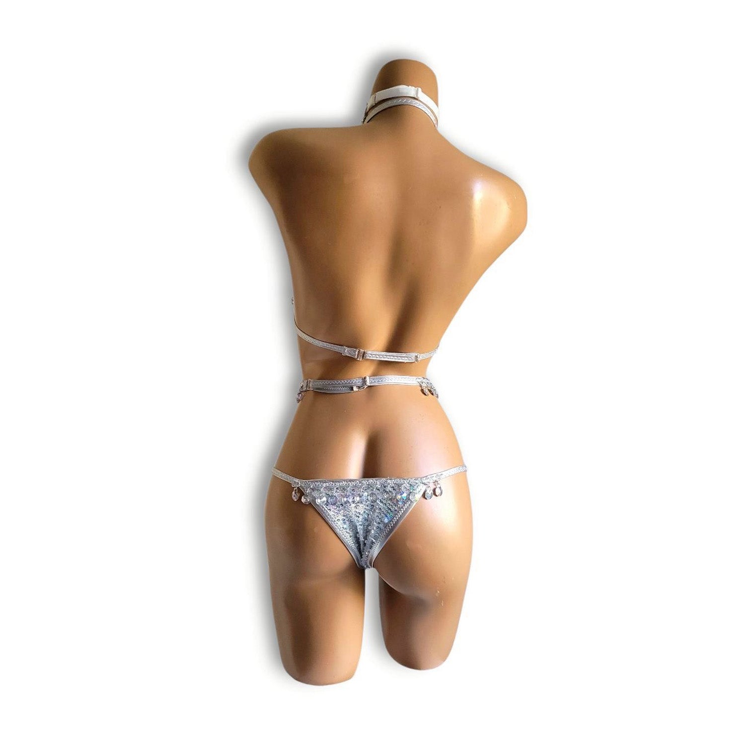 シルバーホログラムビーズフリンジハイウエストビキニ(ハーフバック)