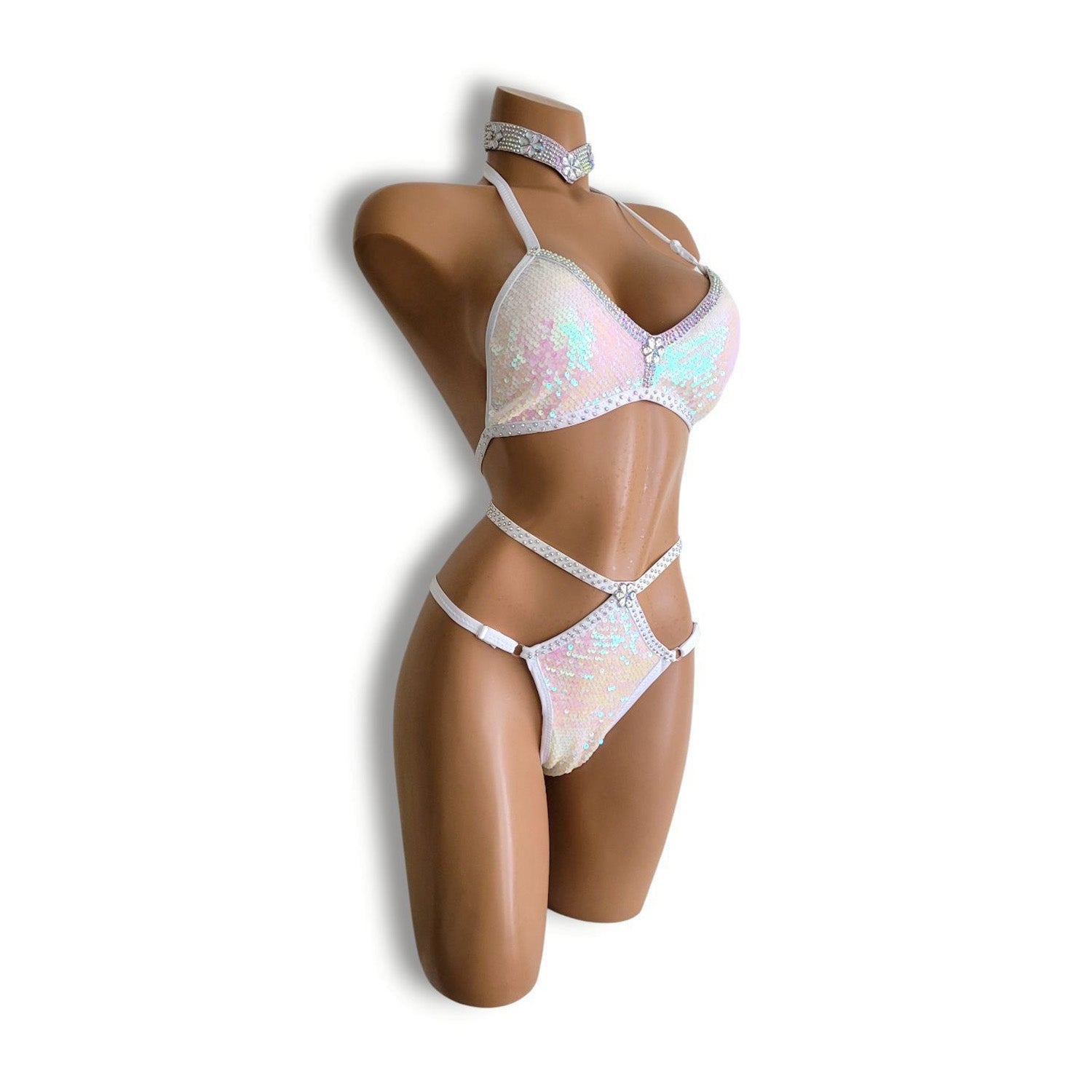Like a princess adorned in elegance and grace, this white aurora sequin high-waist bikini and stone-embellished choker set is designed to turn that vision into reality. The finely shimmering white aurora sequins catch the light from every angle, casting a soft yet radiant glow under stage lighting. The purity of crisp white blends beautifully with the iridescent aurora sheen, creating a look that feels both refined and strikingly memorable.