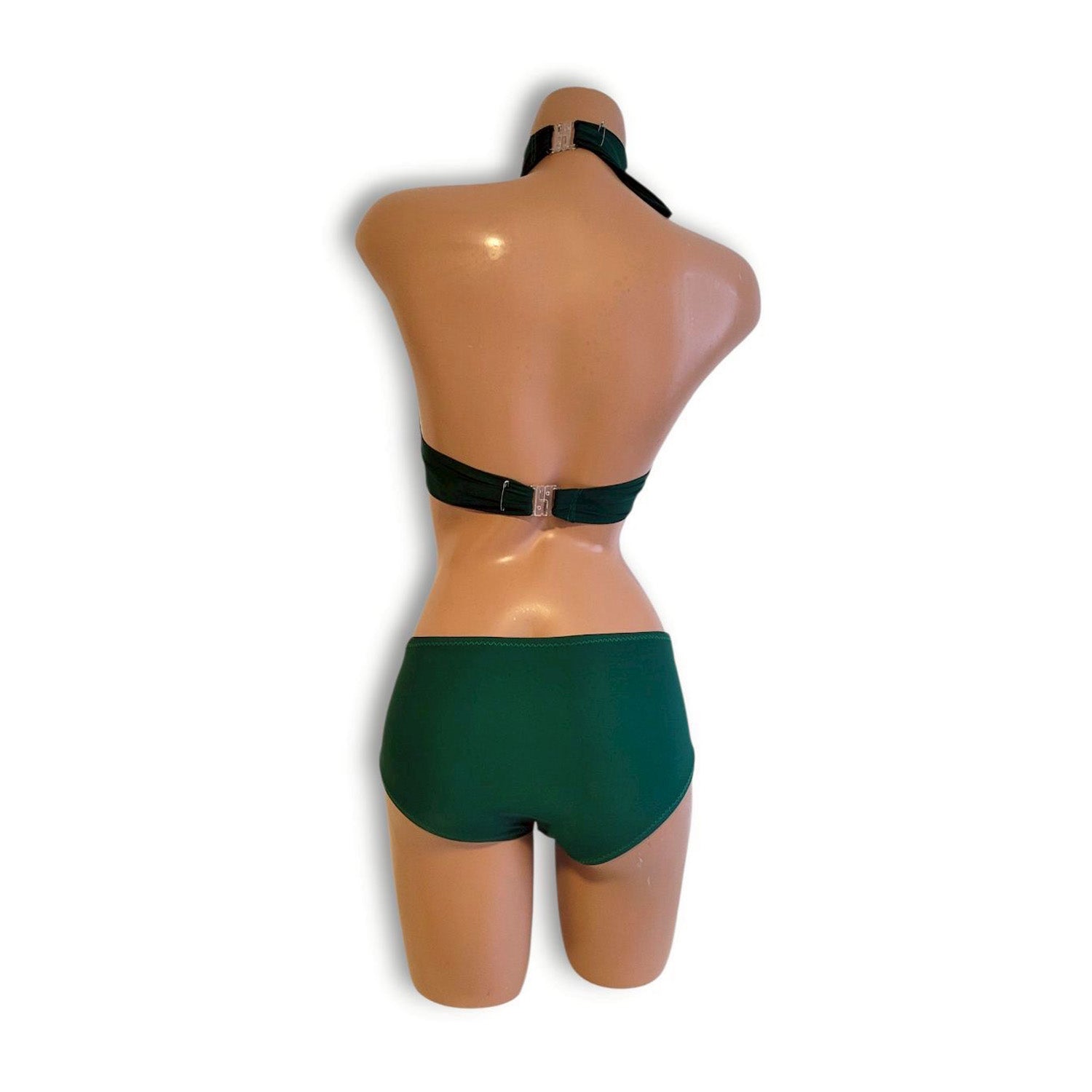 The bottoms feature a secure full-back design, offering stability and confidence even during high-energy performances. The neck and back under bust closures use plastic hooks for easy dressing and removal. The piece is currently temporarily secured with safety pins, allowing you to hand-sew and adjust it to best suit your body shape and preferred fit.