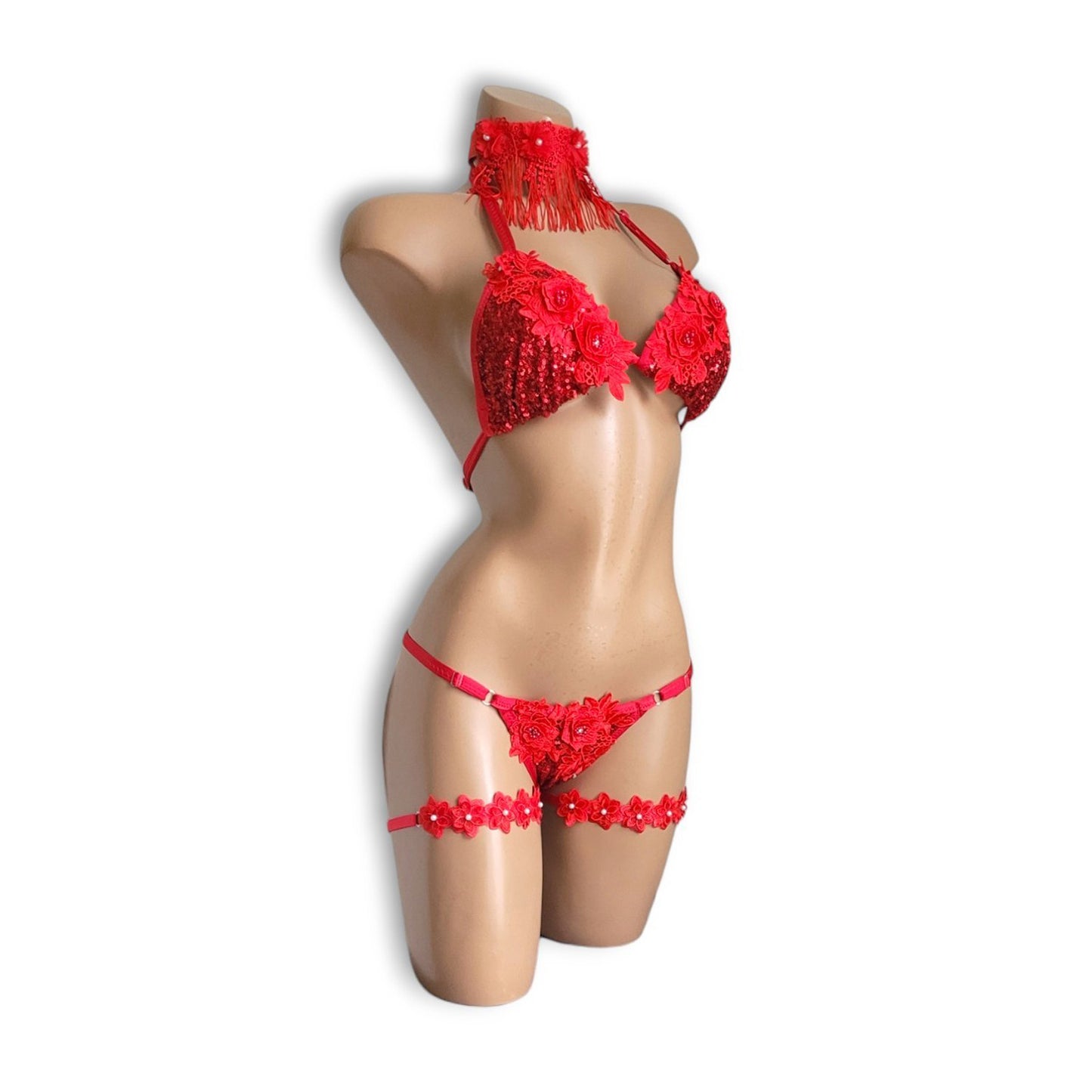 This luxurious, limited-edition set features dazzling red sequins, floral accents, and fringe that sparkle with elegance. The set includes a high-waist bikini, half-back bottoms, a garter ring, and a choker, offering everything you need for a stunning stage look. The brilliant sequins and vibrant floral motifs immediately capture attention, while the fringe sways gracefully with your every move, adding an extra touch of elegance.