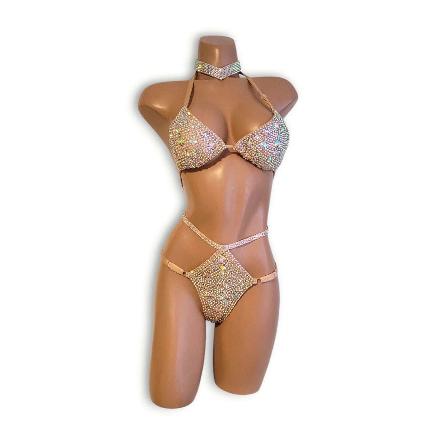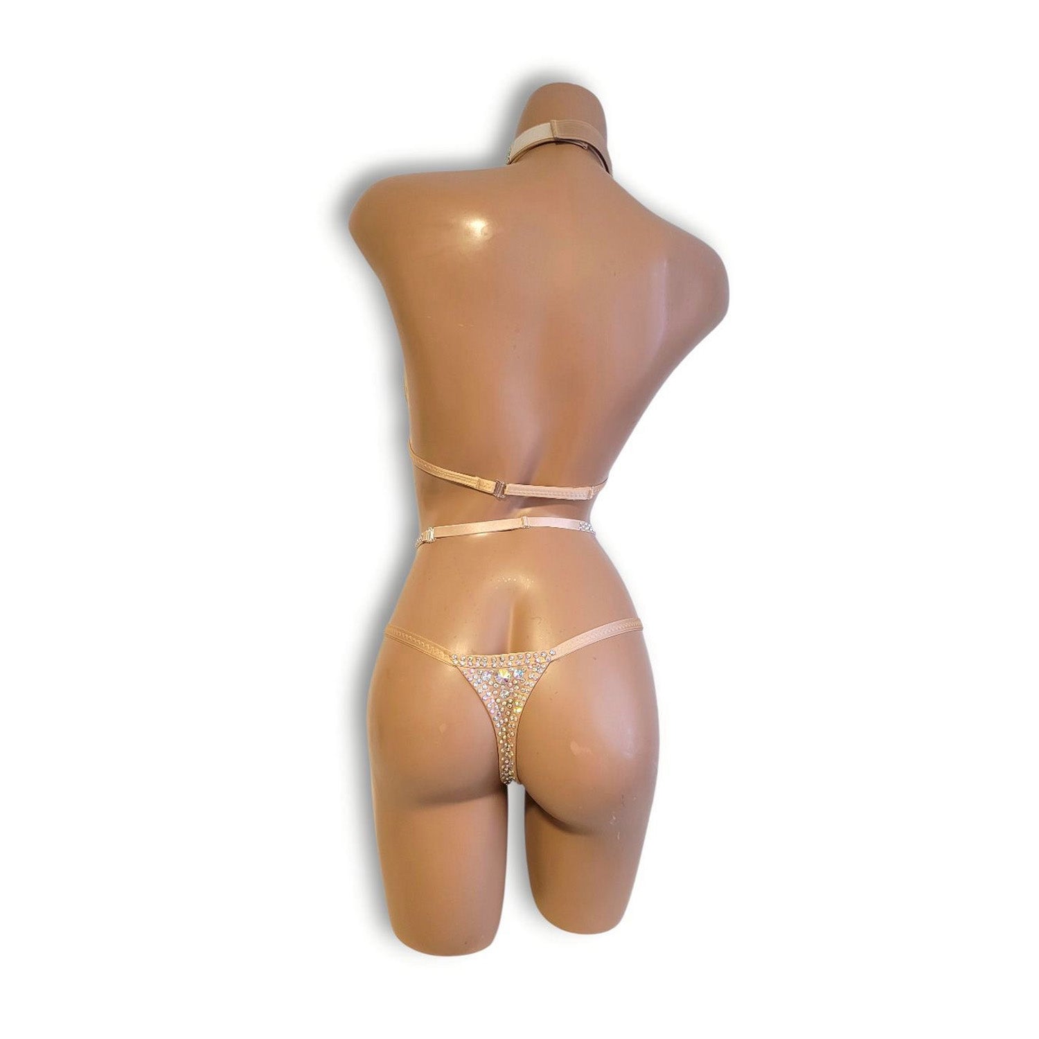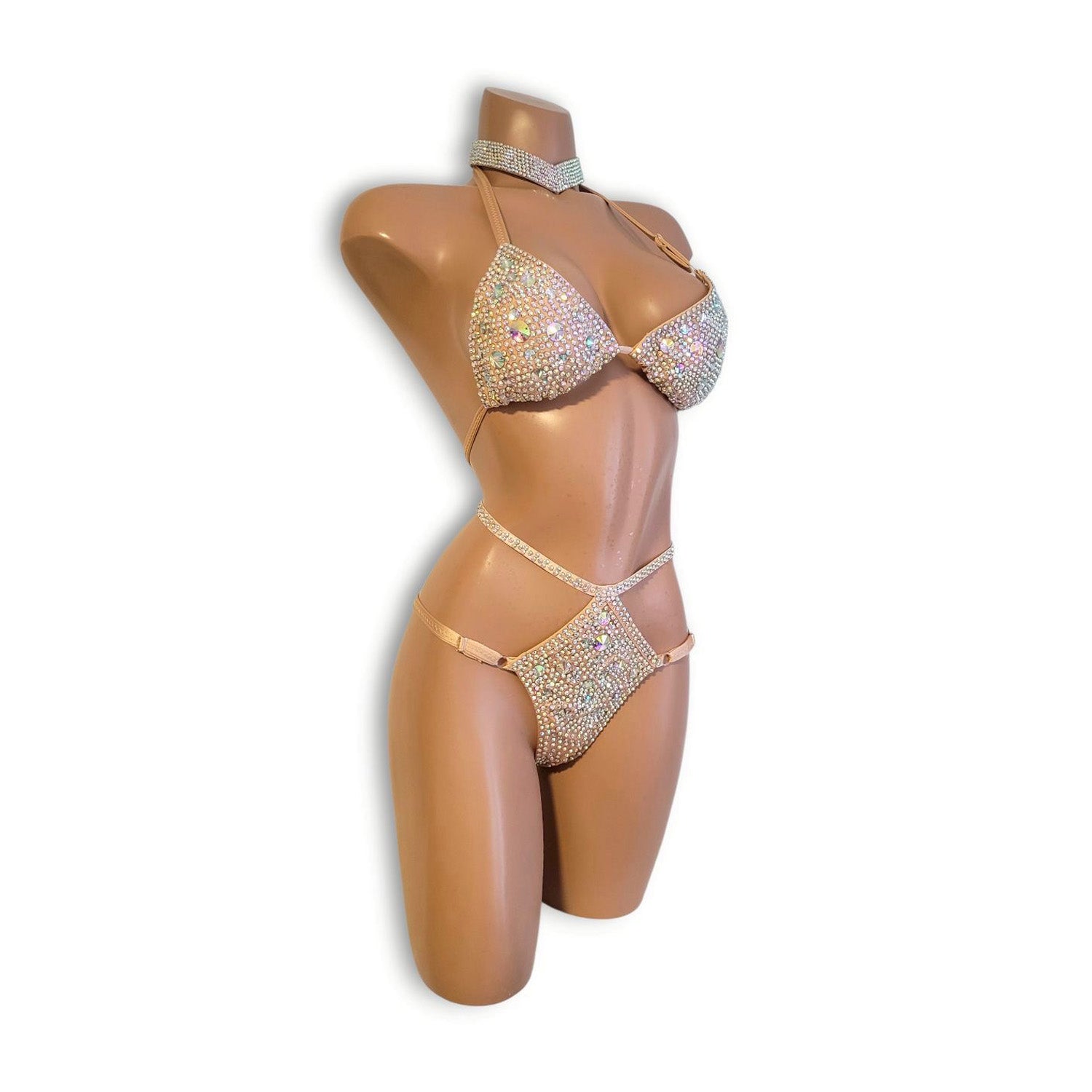 ベージュのストレッチ生地をベースに、オーロラの輝きを放つビジューやストーンを贅沢にあしらった、存在感あふれるハイウエストビキニとチョーカーのセットです。肌なじみの良いベージュカラーがボディラインを美しく引き立て、ステージのライトを受けてきらめく装飾が、ダンサーの動き一つひとつをより華やかに演出します。シンプルなカラーに対して、ぎっしりと配置されたビジューが強いインパクトを生み出し、ステージ上で確かな存在感を放つデザインに仕上がっています。