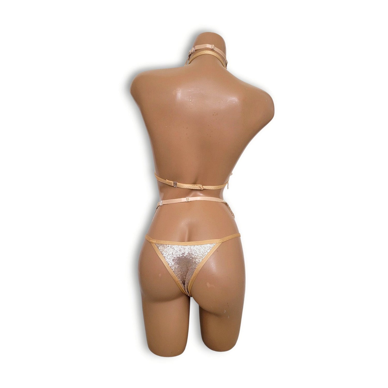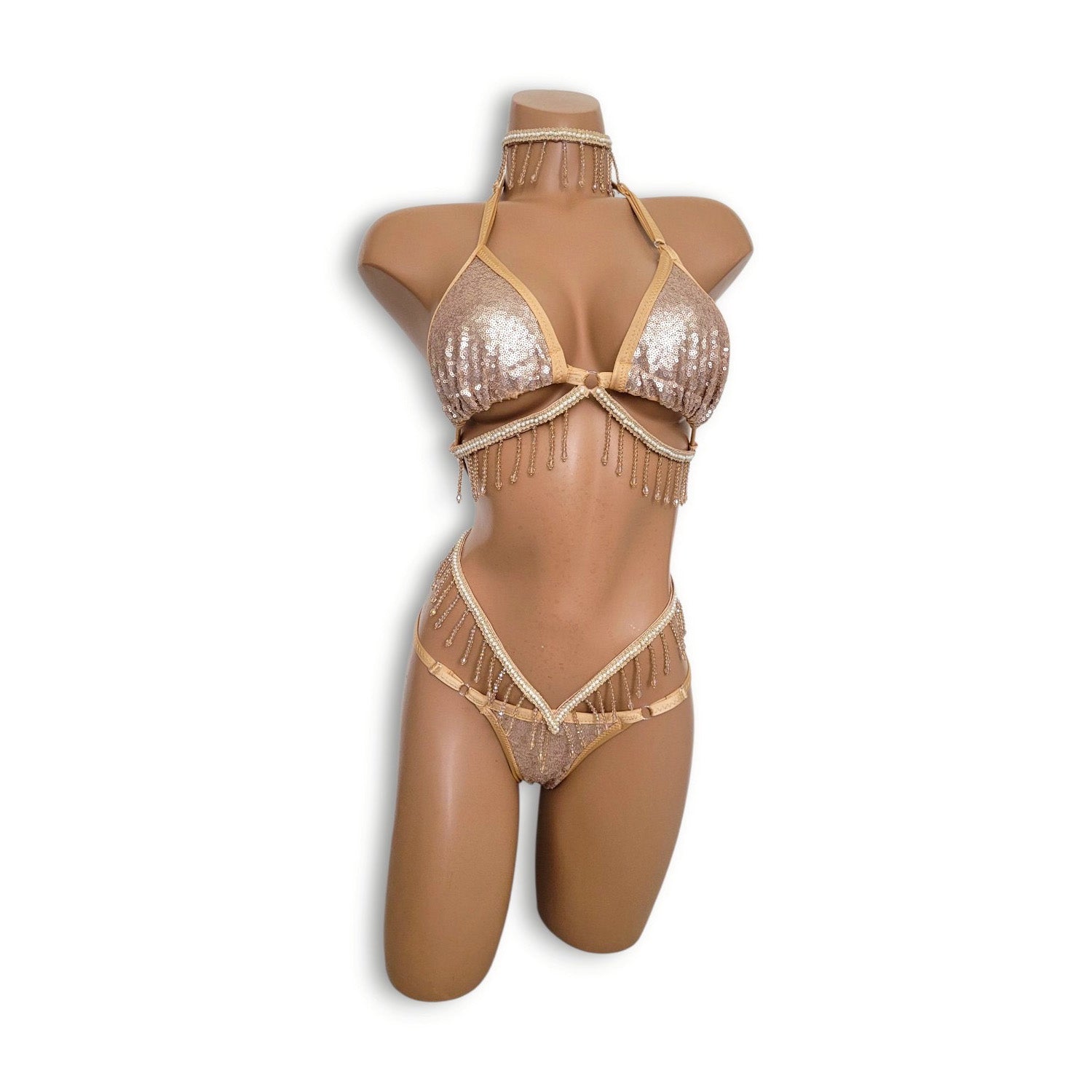 ヌーディーな雰囲気の中に華やかな輝きを。人気のシャンパンベージュカラーで仕上げた、スパンコールビキニとチョーカーの限定セット。肌なじみの良いカラーが自然な美しさを引き立てつつ、繊細に輝くスパンコールと揺れるビーズフリンジが、動くたびに視線を集める、とびきり可愛らしいデザインです。
