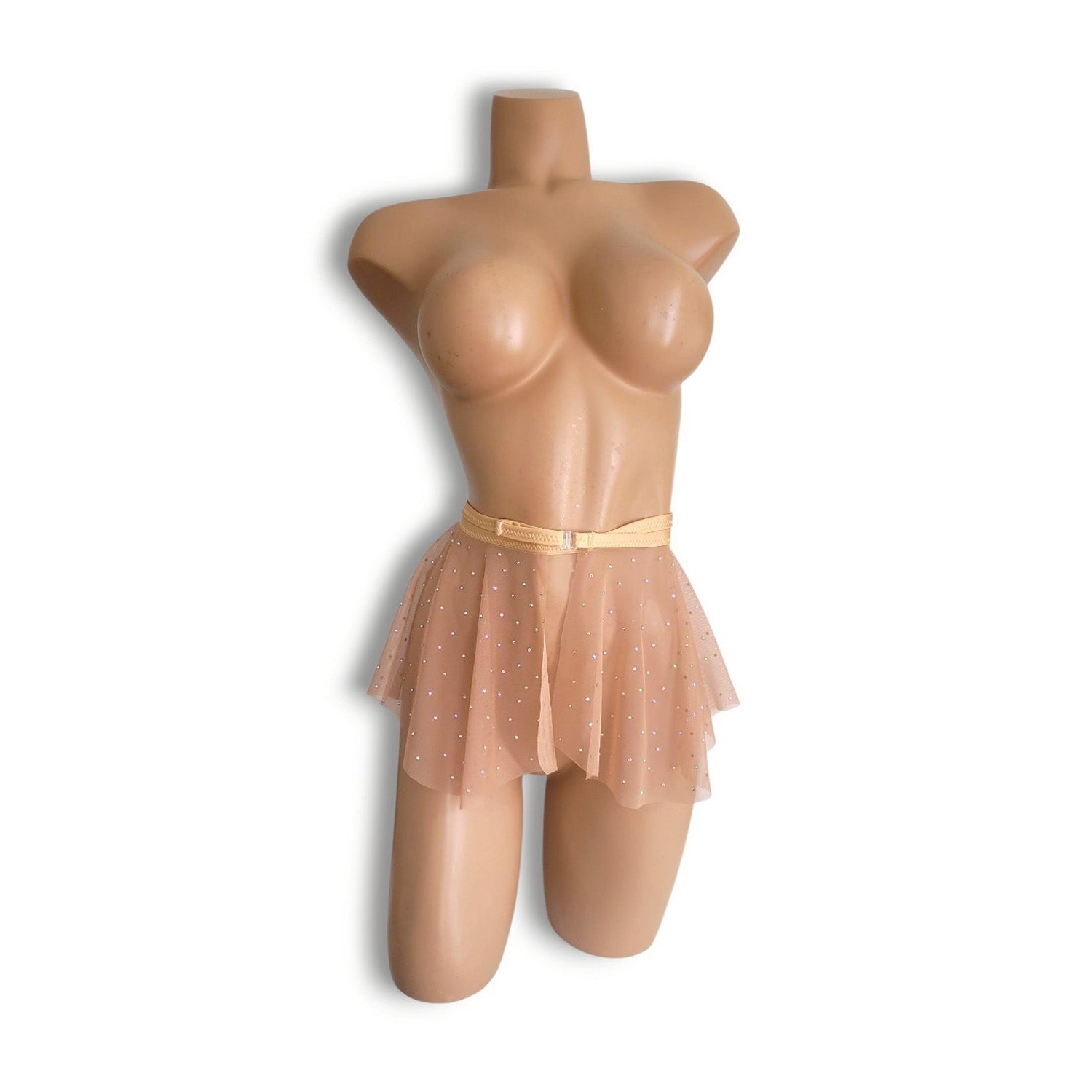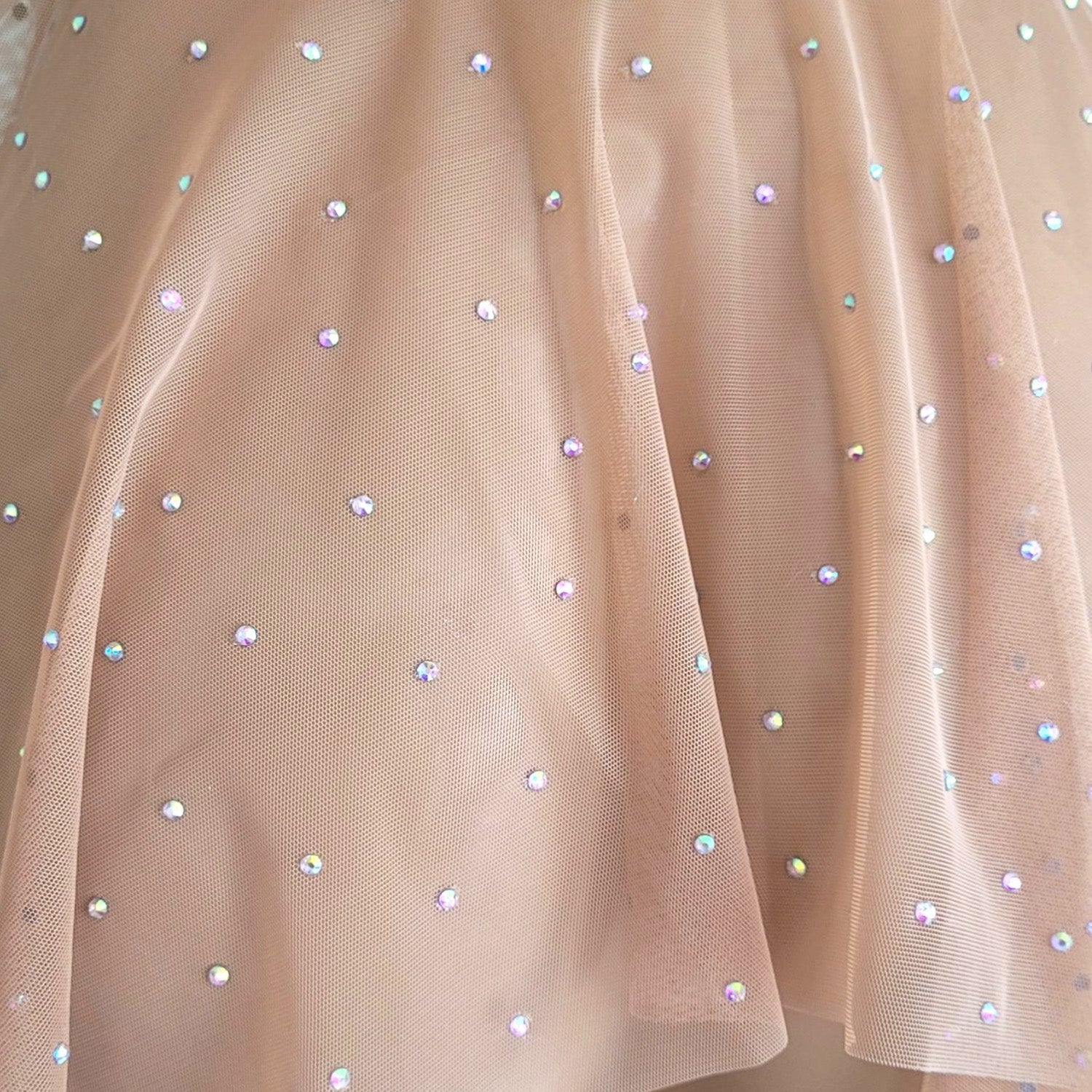 まるでフィギュアスケートの衣装を思わせるような、上品で華やかな印象をまとったスカート。繊細なヌーディーカラーのベージュシフォン生地に、無数のストーンが贅沢に散りばめられ、光を受けてきらきらと輝く様子は、まさに舞台の主役にふさわしい美しさです。