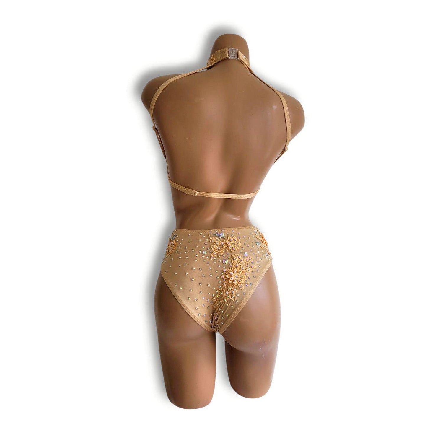 舞台に立つ瞬間をひときわ輝かせるために誕生した、限定品のレオタードです。落ち着いたベージュのストレッチ生地をベースに、繊細な花モチーフと光を受けて多彩な輝きを放つオーロラストーンを贅沢に散りばめ、ヌーディでありながら上品さと華やかさを同時に引き立てる特別な一着に仕上げました。胸元には透明感のあるパワーネット生地を使用し、動きに合わせてしなやかに表情を変えるドラマティックなデザインが、ステージ映えをいっそう高めてくれます。
