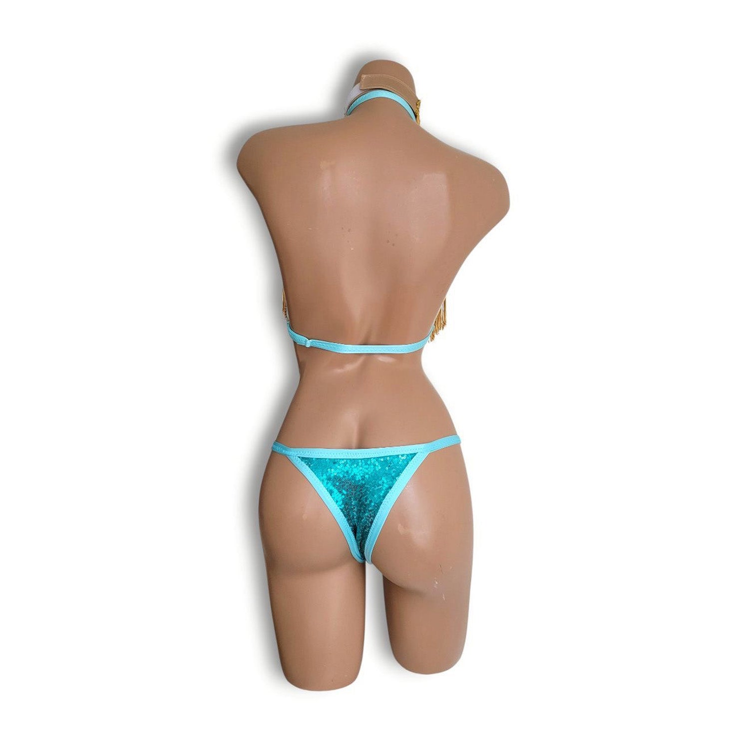 ステージでひときわ目を引く、爽やかなミントグリーンのスパンコールが輝くテディとチョーカーのセットです。光を受けて繊細にきらめくスパンコールに、上品なゴールド系モチーフをあしらうことで、華やかさと高級感を兼ね備えたデザインに仕上げました。動きに合わせて揺れるフリンジが視線を集め、ダンスパフォーマンスをよりダイナミックに演出します。