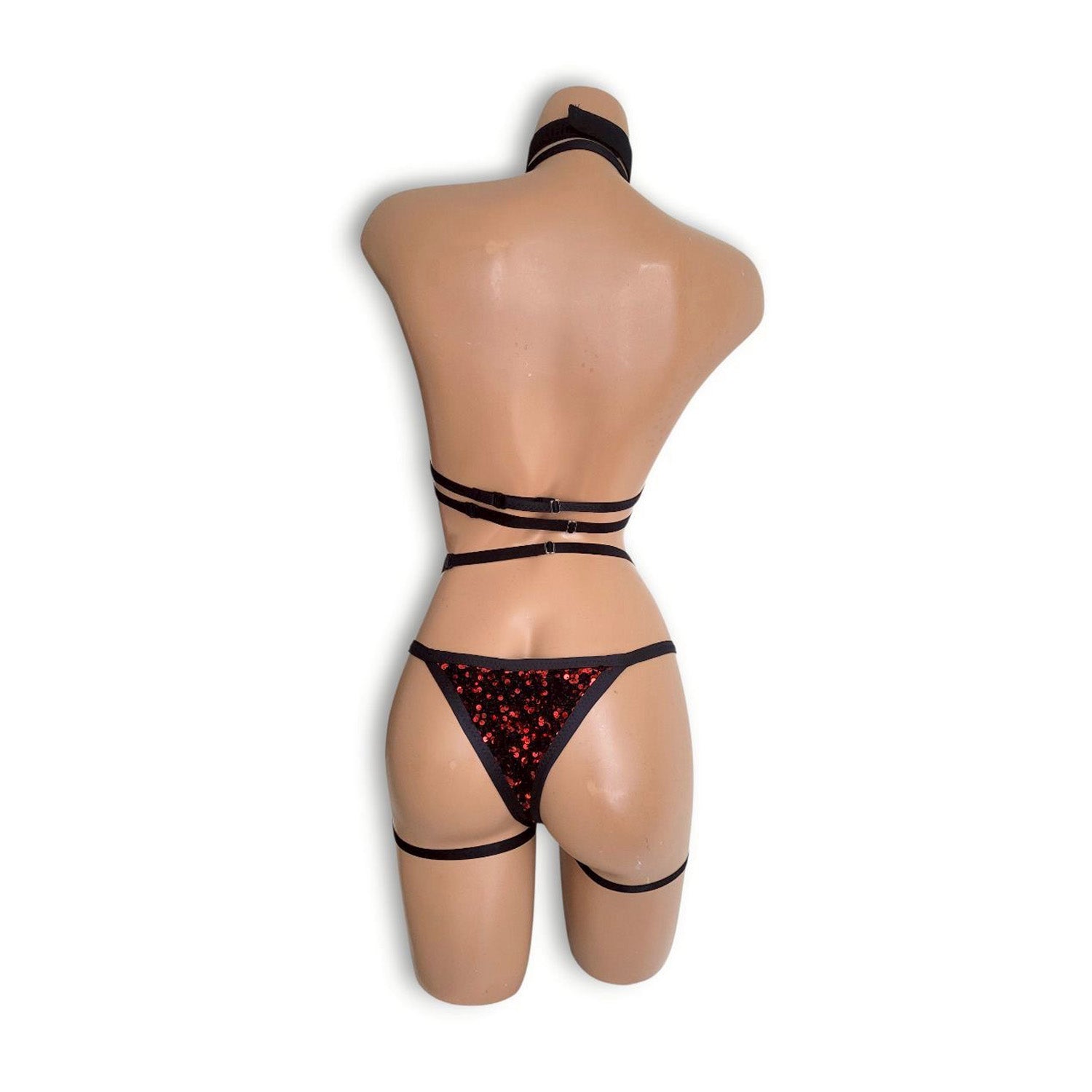 重厚感のある黒ベロアに、鮮やかな赤スパンコールを組み合わせた印象的な生地で仕立てたビキニと、セパレートハーネスのセットです。深みのあるブラックと輝きを放つレッドのコントラストが、ステージ上で圧倒的な存在感を演出し、力強く魅惑的なスタイルを完成させます。ビキニはボディラインを美しく引き立てるシルエットに仕上げられており、動きに合わせてスパンコールが光を反射し、パフォーマンスをより華やかに彩ります。