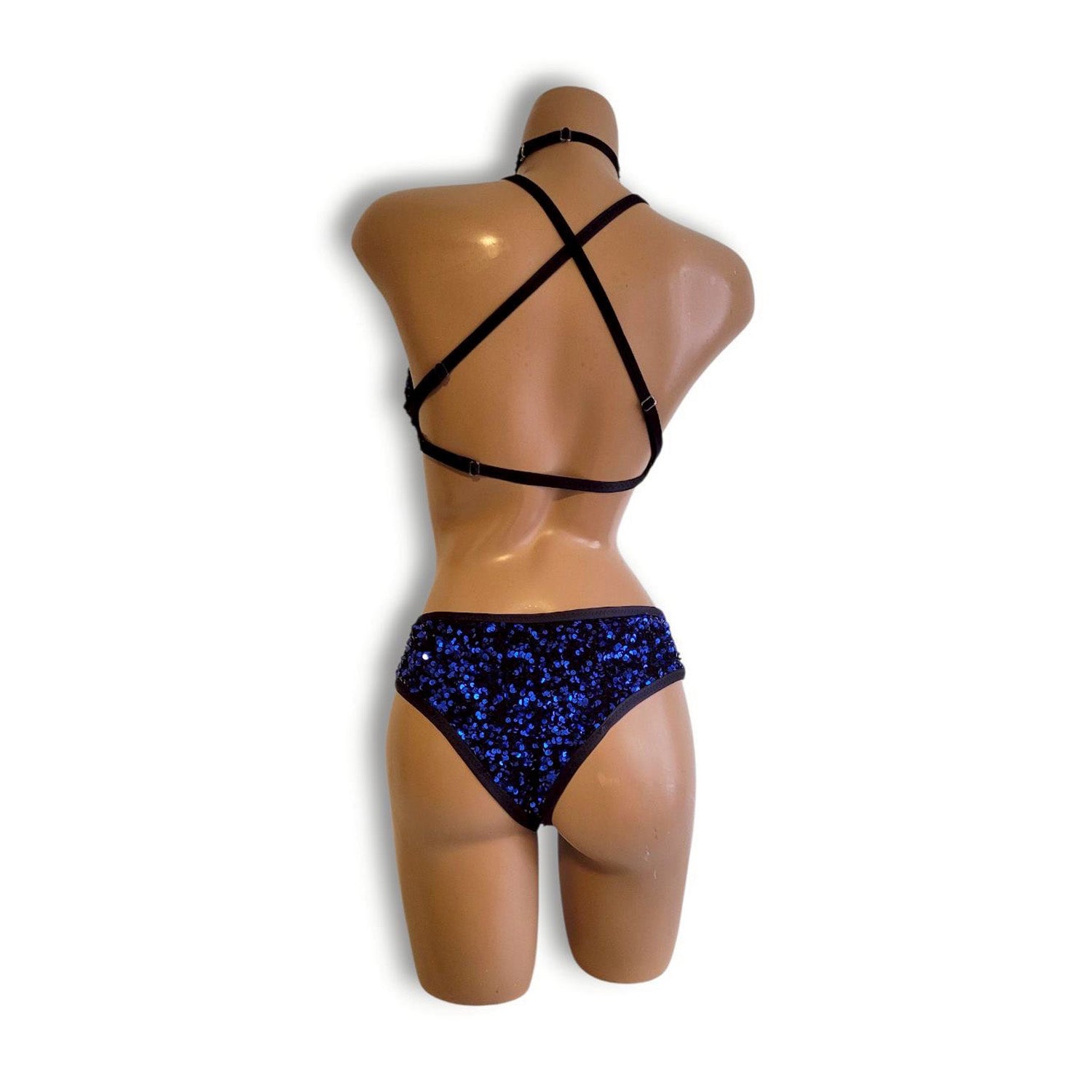 紐部分にはプラスチック製アジャスターを採用しており、体型に合わせてサイズ調整が可能。アンダーバストの紐とチョーカーはプラスチックホックで簡単に着脱できるため、着替えが多いイベントやショーの現場でもスムーズに扱えます。フィット感と扱いやすさの両方を考慮した仕様で、パフォーマンスに集中できる着心地を実現しました。