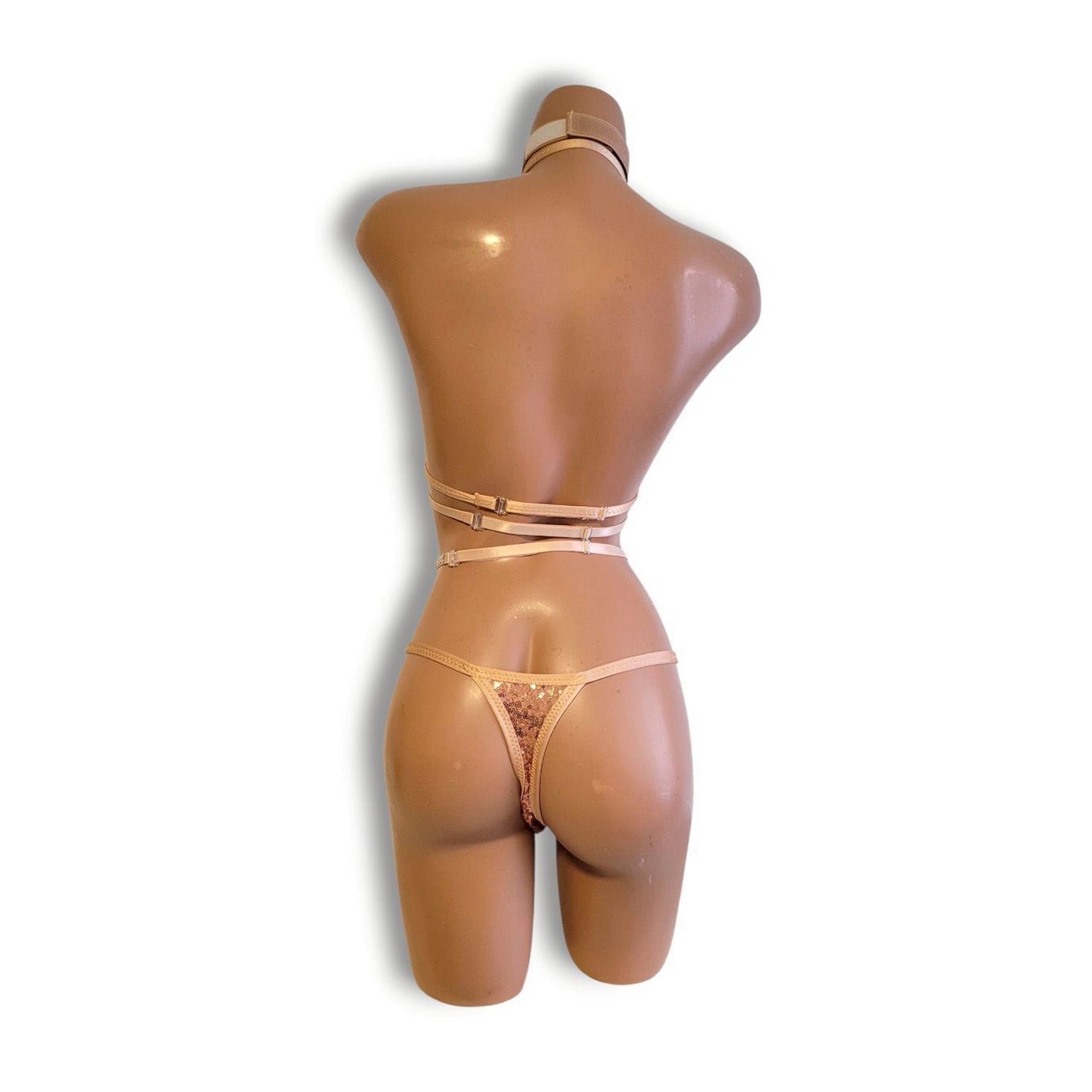 ヌーディで神秘的な輝きをまとったローズゴールドスパンコール生地のハイウエストビキニに、セパレートハーネス(上)を組み合わせた印象的なセットです。肌に溶け込むようなローズゴールドの色味に、繊細なスパンコールが重なり合い、ステージライトを受けるたびに幻想的なきらめきを放ちます。強く主張しすぎないのに、確実に視線を惹きつける上品な輝きは、大人の色気と洗練された雰囲気を演出します。