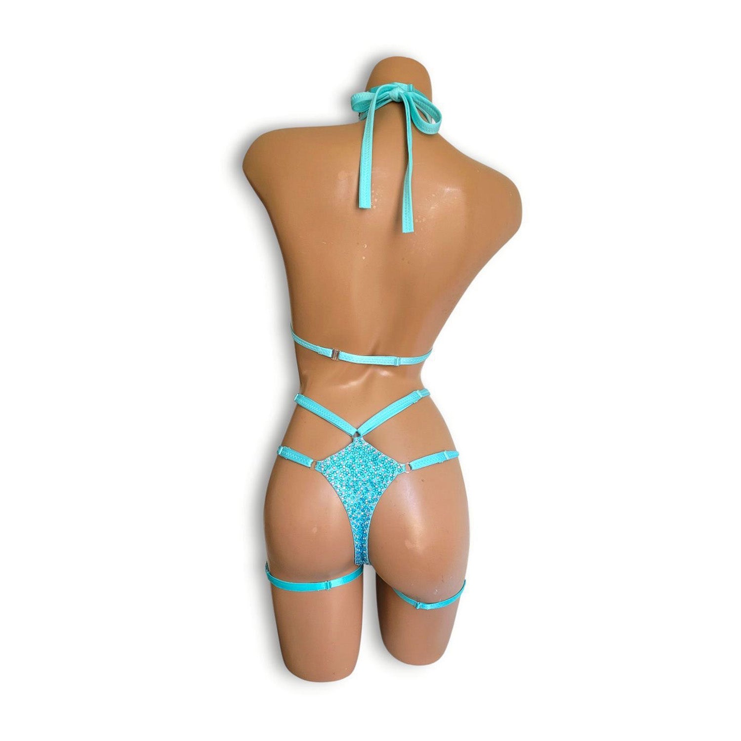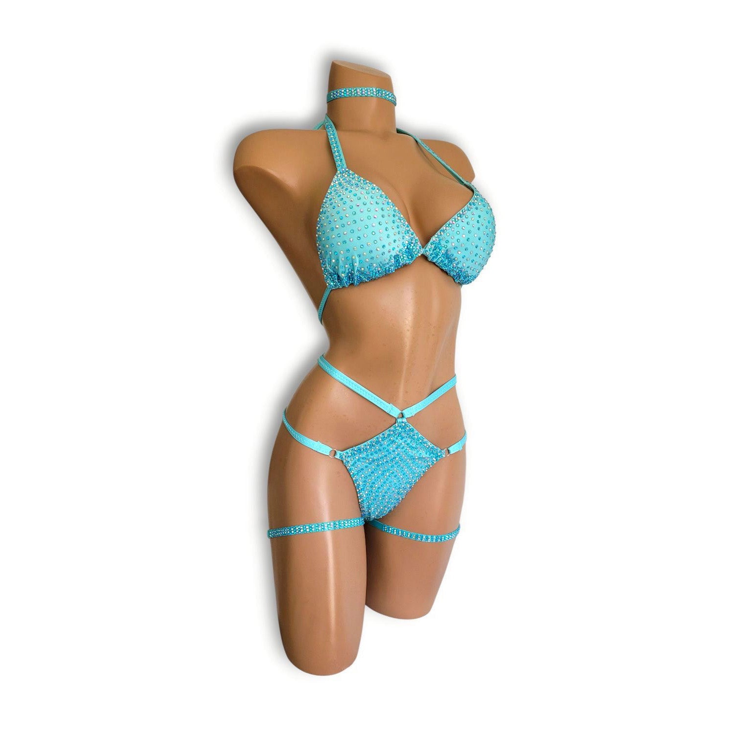 清涼感あふれる爽やかな水色のストレッチ生地に、きらめくストーンを贅沢にあしらった、ハイウエストビキニ・チョーカー・ガーターリングの豪華3点セットです。透明感のあるカラーはステージ照明との相性も抜群で、動くたびにストーンが反射し、軽やかで洗練された輝きを放ちます。華やかさの中に上品さも感じさせるデザインは、ダンサーの魅力を引き立て、印象に残るステージスタイルを完成させます。