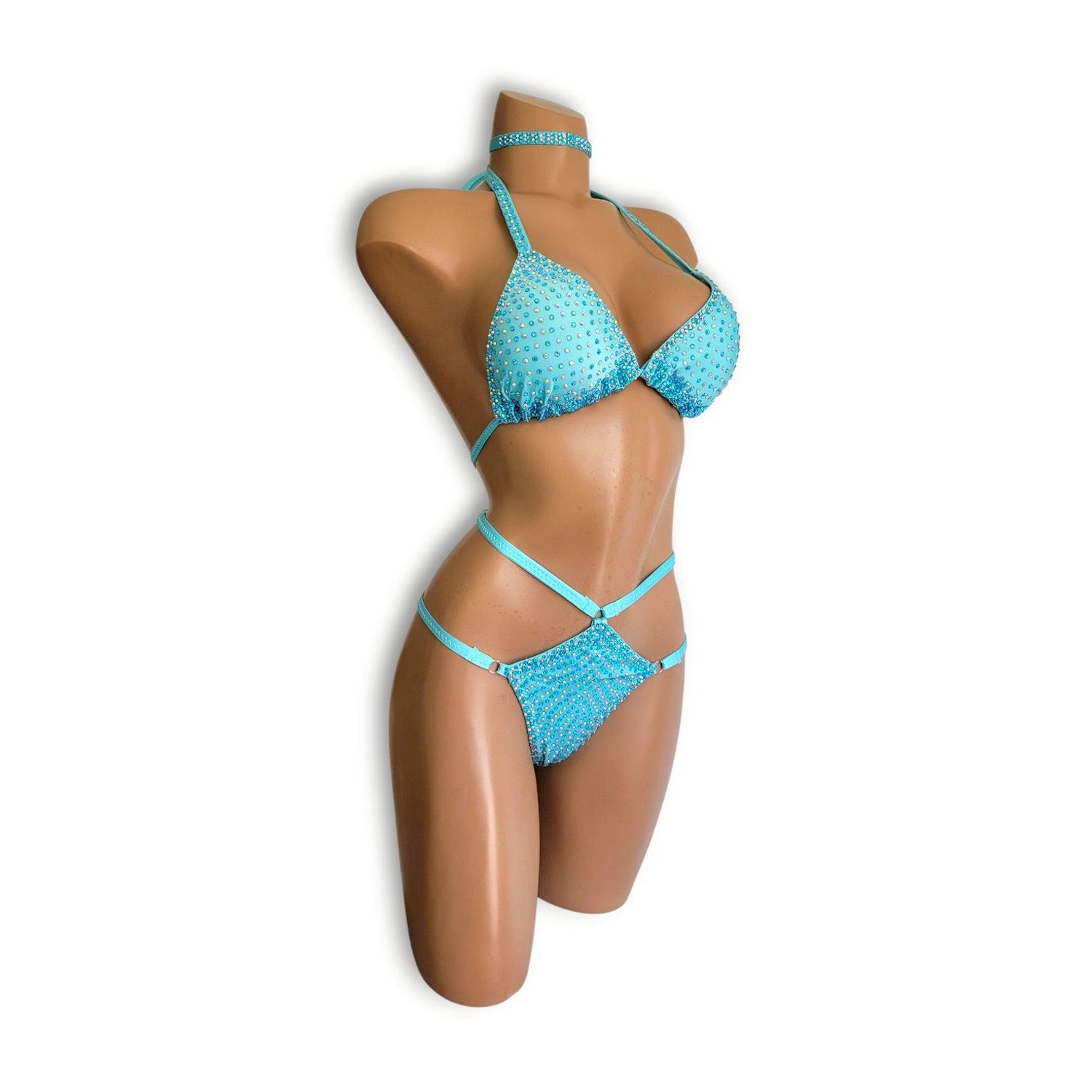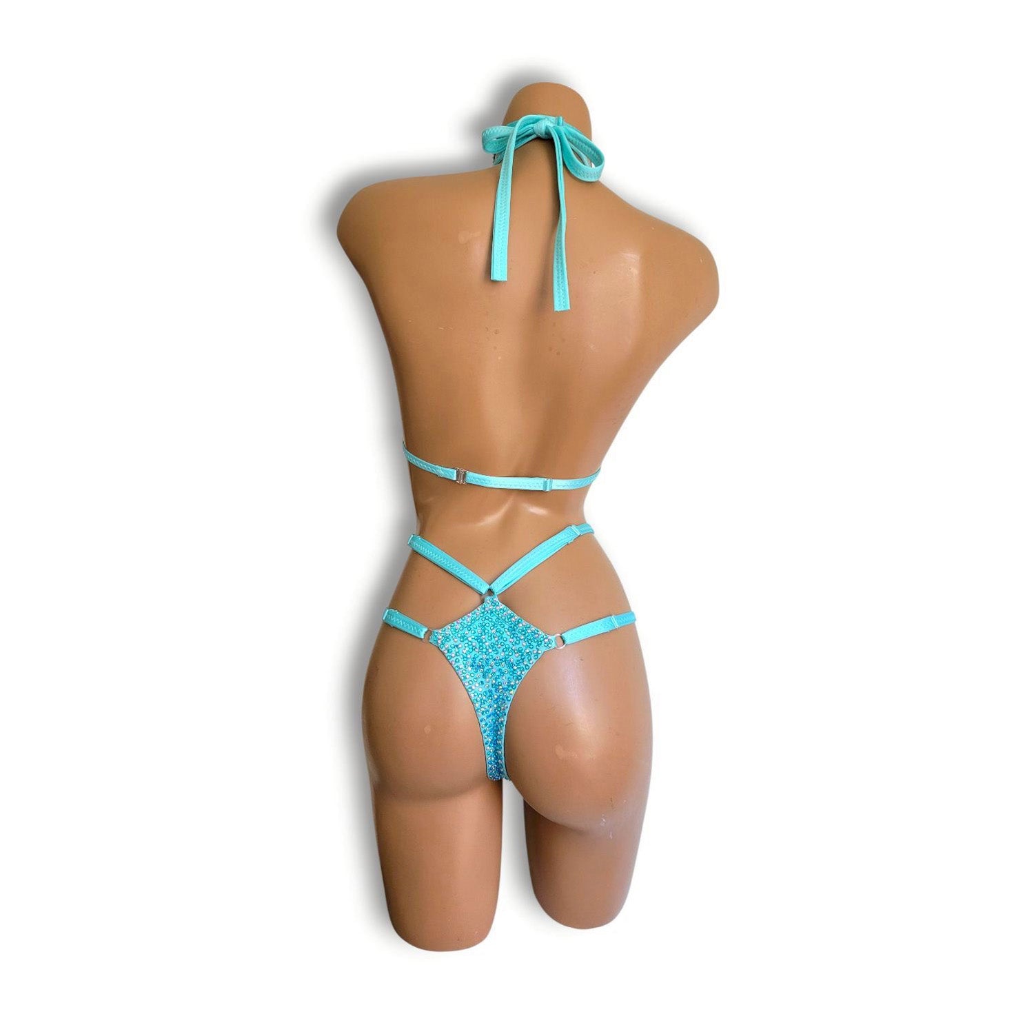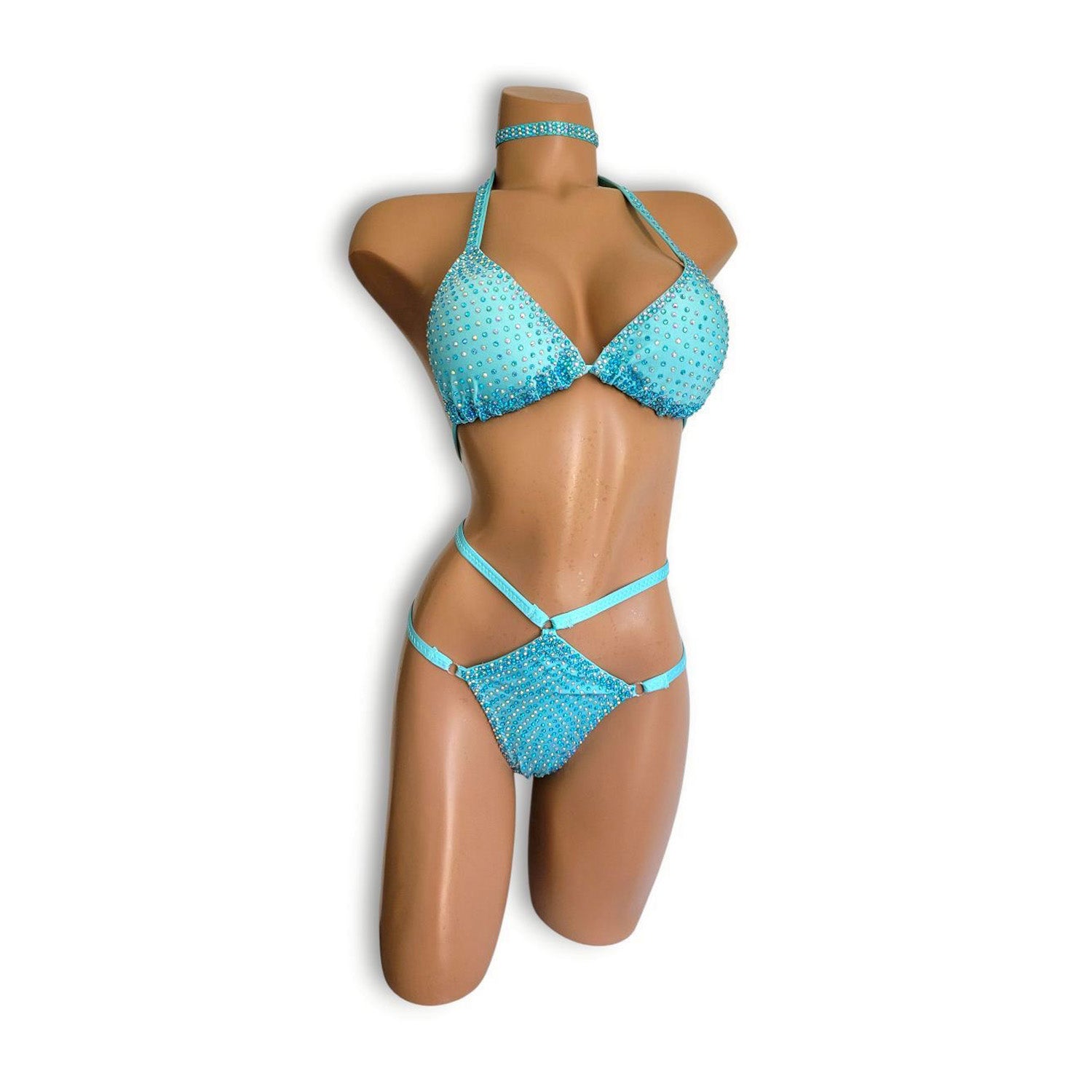 清涼感あふれる爽やかな水色のストレッチ生地に、きらめくストーンを贅沢にあしらった、ハイウエストビキニ・チョーカーの2点セットです。透明感のあるカラーはステージ照明との相性も抜群で、動くたびにストーンが反射し、軽やかで洗練された輝きを放ちます。華やかさの中に上品さも感じさせるデザインは、ダンサーの魅力を引き立て、印象に残るステージスタイルを完成させます。