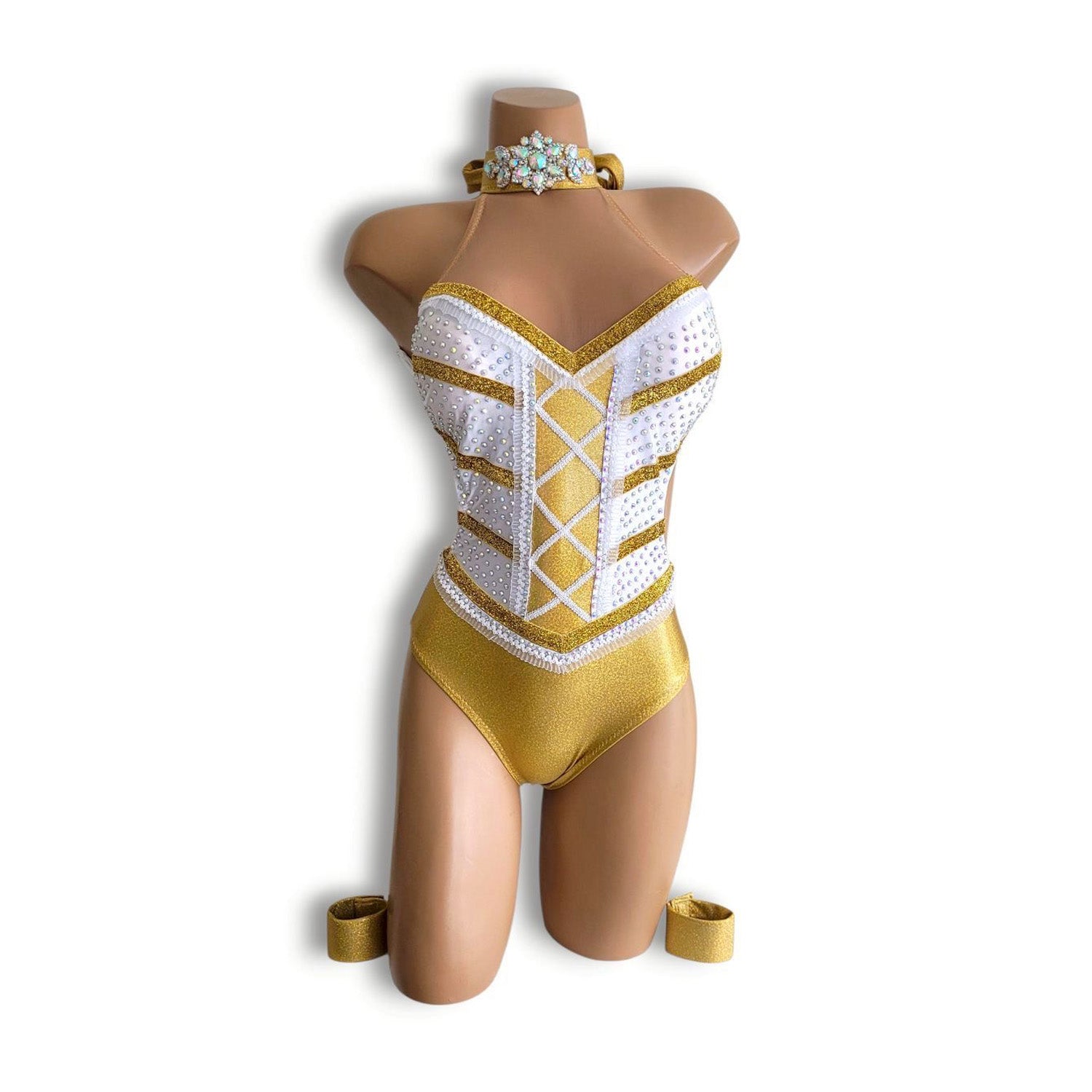 まるで舞い降りた女神のような気品をまとえる、白とゴールドの美しいレオタードとカフスのセットです。清らかなホワイトにリュクスなゴールドを組み合わせた配色は、上品でありながら華やかさも兼ね備え、舞台の上でひときわ目を引く存在感を放ちます。