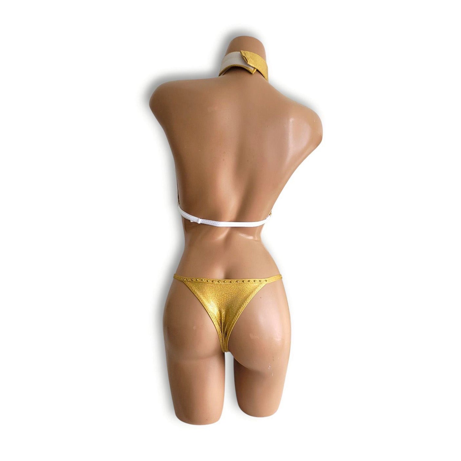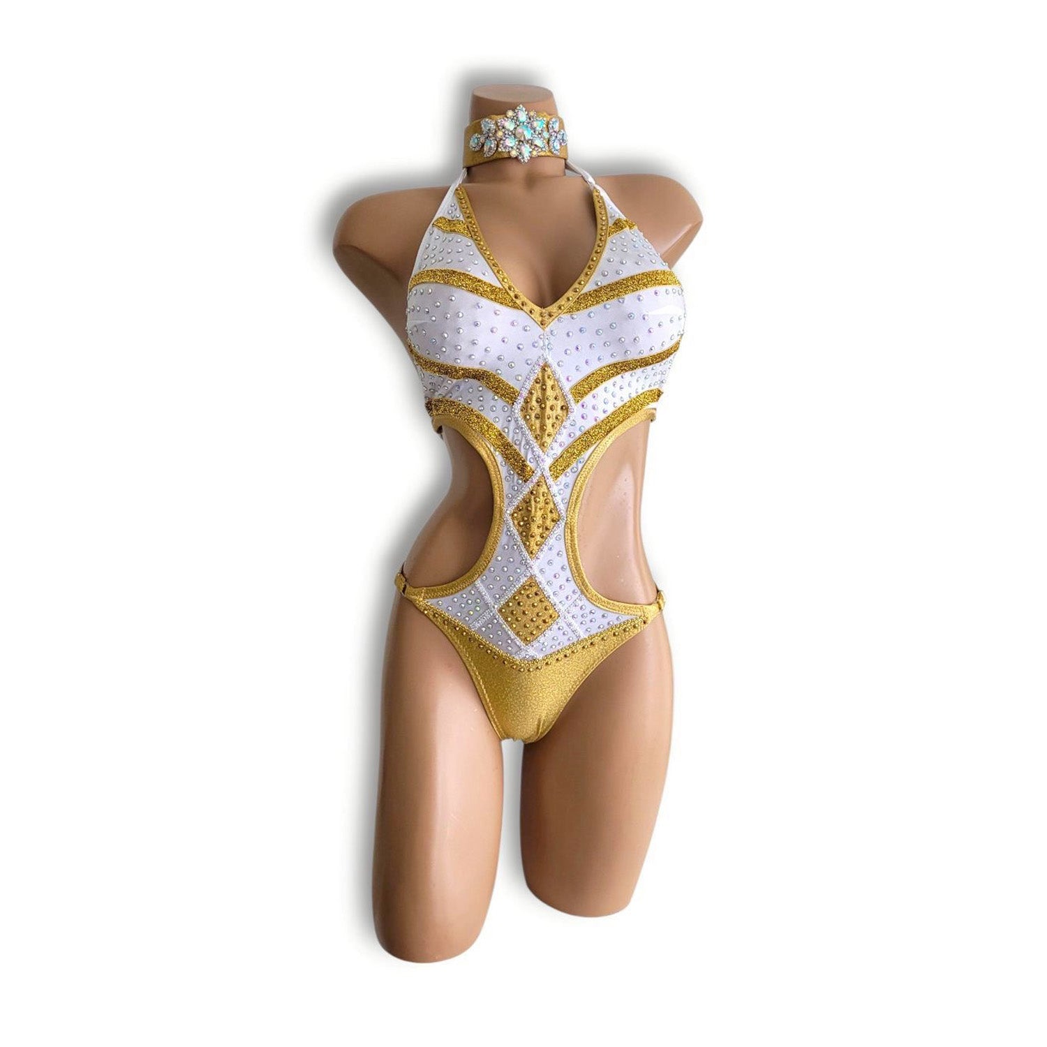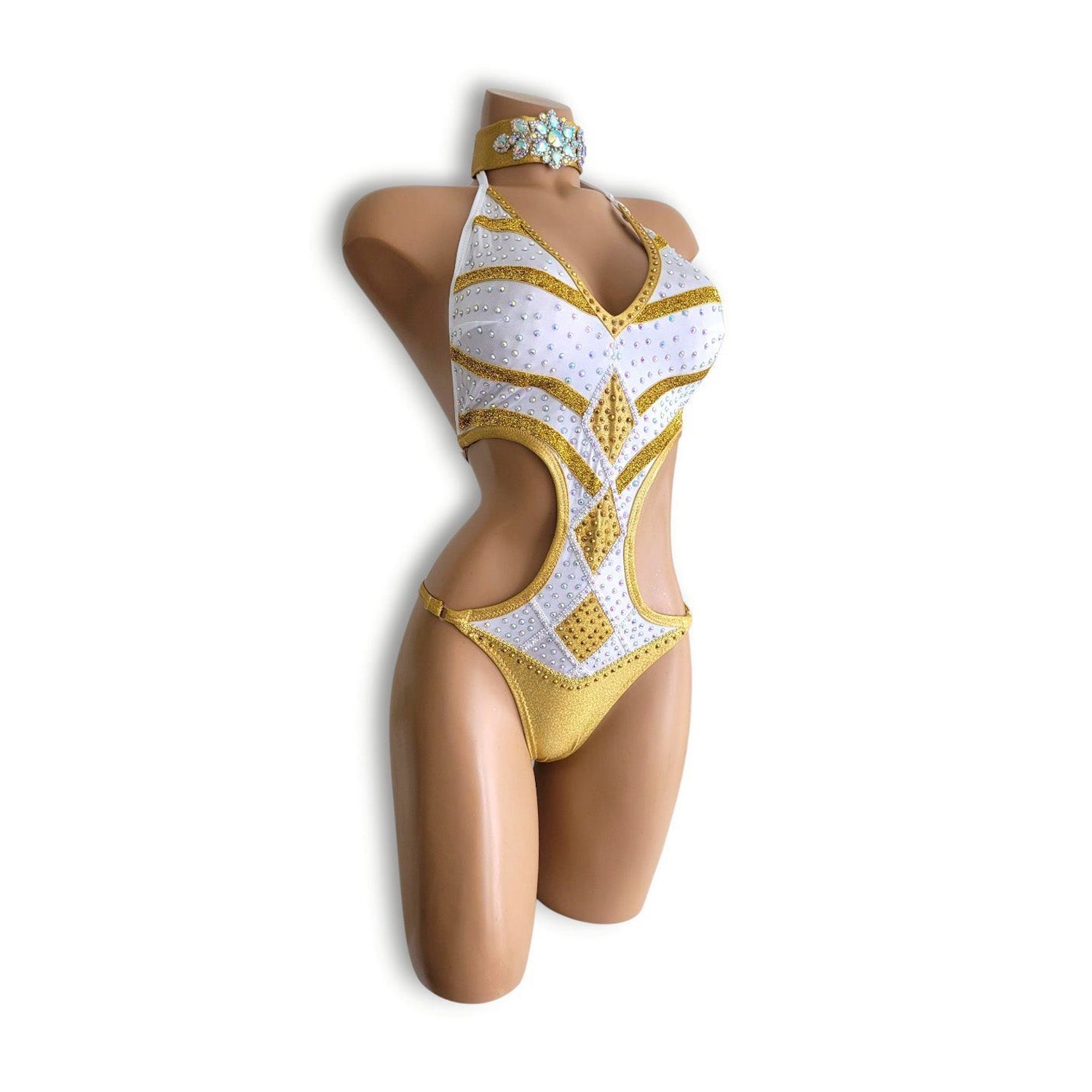 白とゴールドの洗練された配色に、キラリと輝くストーンが散りばめられたエレガントなテディ。見る者の視線を惹きつけるそのデザインは、ステージや特別なシーンにふさわしい気品と華やかさを兼ね備えています。ストライプ模様が全体を引き締め、スタイルアップを叶える視覚効果も魅力のひとつ。