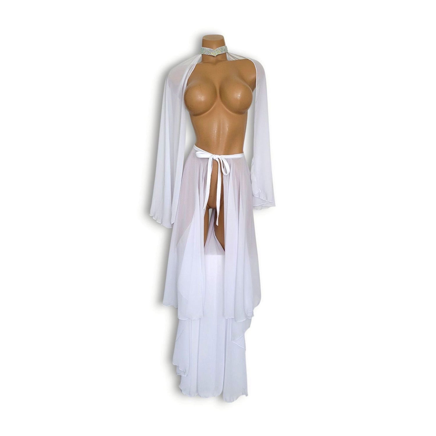 軽やかで幻想的な印象を演出する白シフォンスカートと、ひらひらと揺れる布が一体化したストーン付チョーカーの2点セット。気品あふれる佇まいとピュアな透明感が調和し、まさに“女神”のような存在感を引き立てるアイテムです。