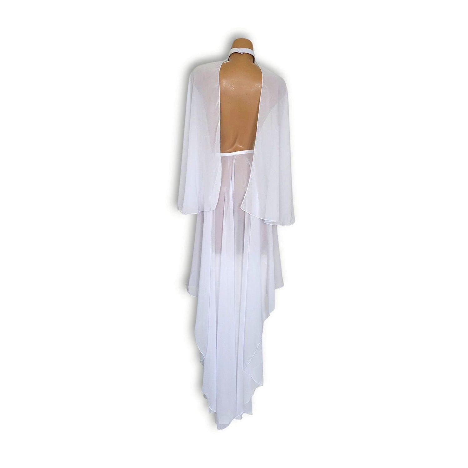スカートは繊細な白のシフォン生地を使用し、ふんわりとした揺れ感と美しいシルエットを実現。前側は短めに設計されており、足さばきが良く、動きの多いパフォーマンスにも最適です。ウエストはフロントの紐で結ぶ仕様になっており、ショーやイベントの合間でも簡単に着脱可能。スカートの最長部は約100〜110cmと、しなやかなラインで優雅に流れるデザインです。