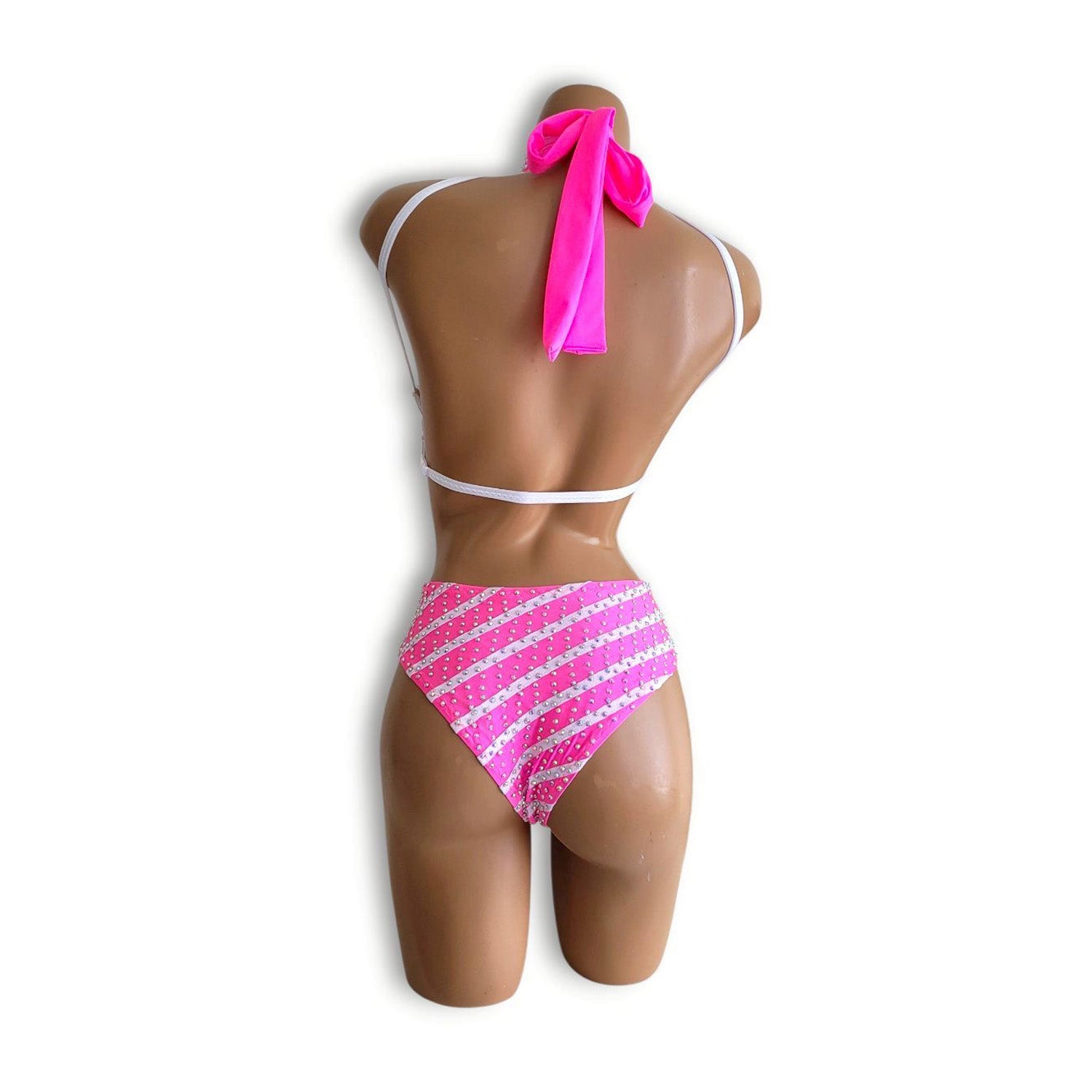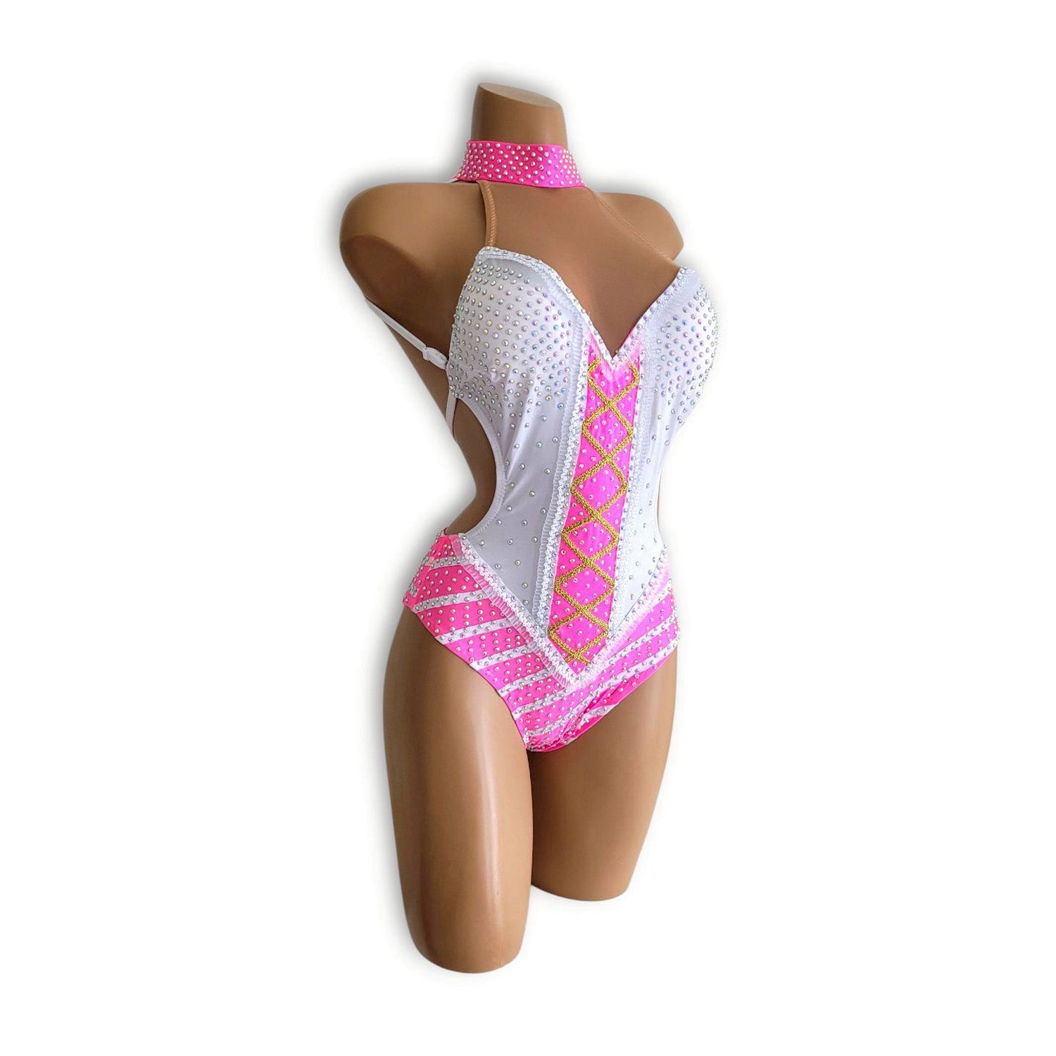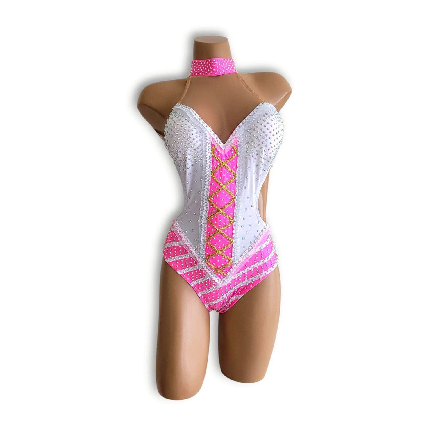 思わず目を奪われる、最高にポップでキュートな配色。白×ピンク、そしてストライプの大胆な組み合わせが魅力のデザイン性あふれるレオタード。細部までこだわった装飾と、華やかなストーンがきらめきを添え、ステージやイベントで主役級の存在感を放ちます。