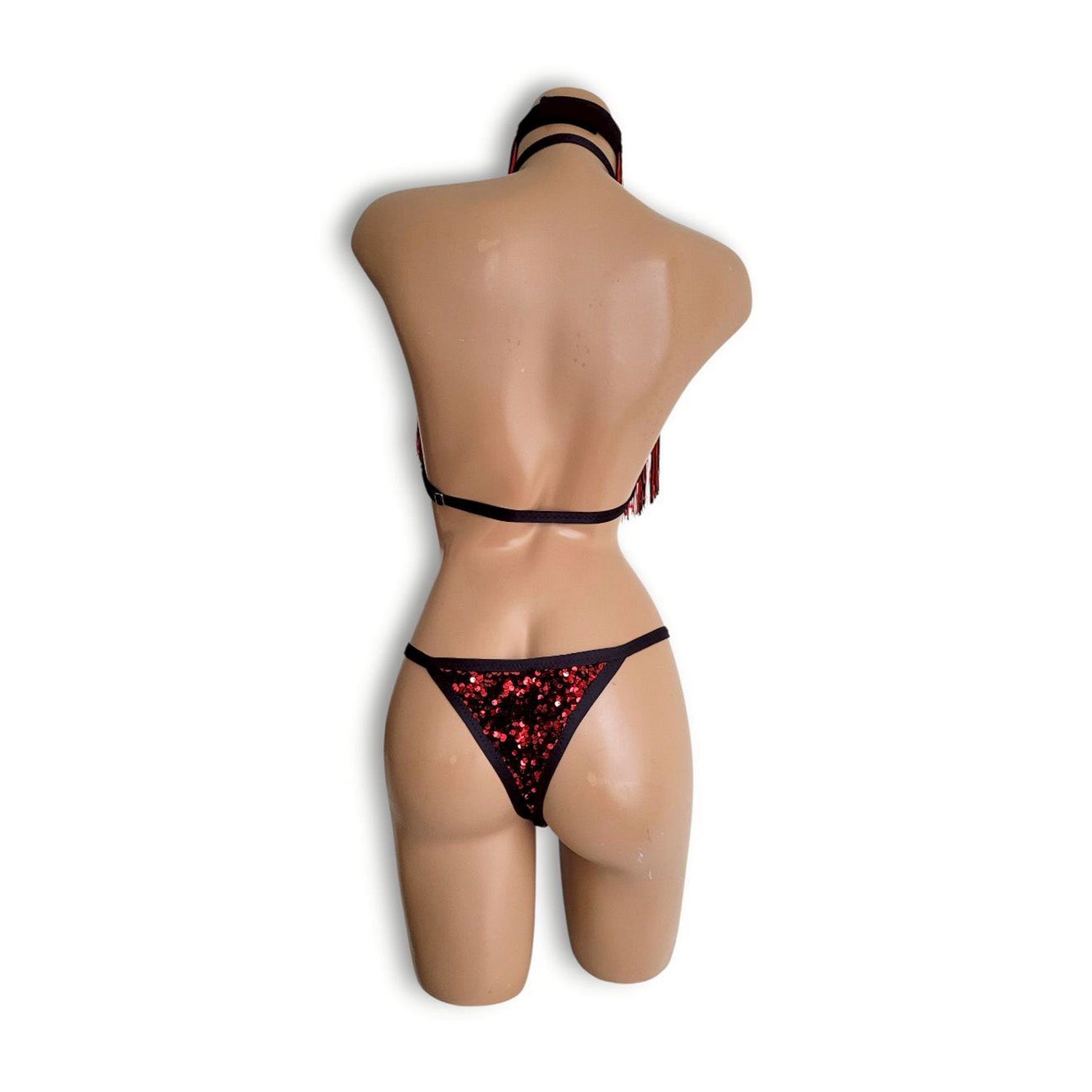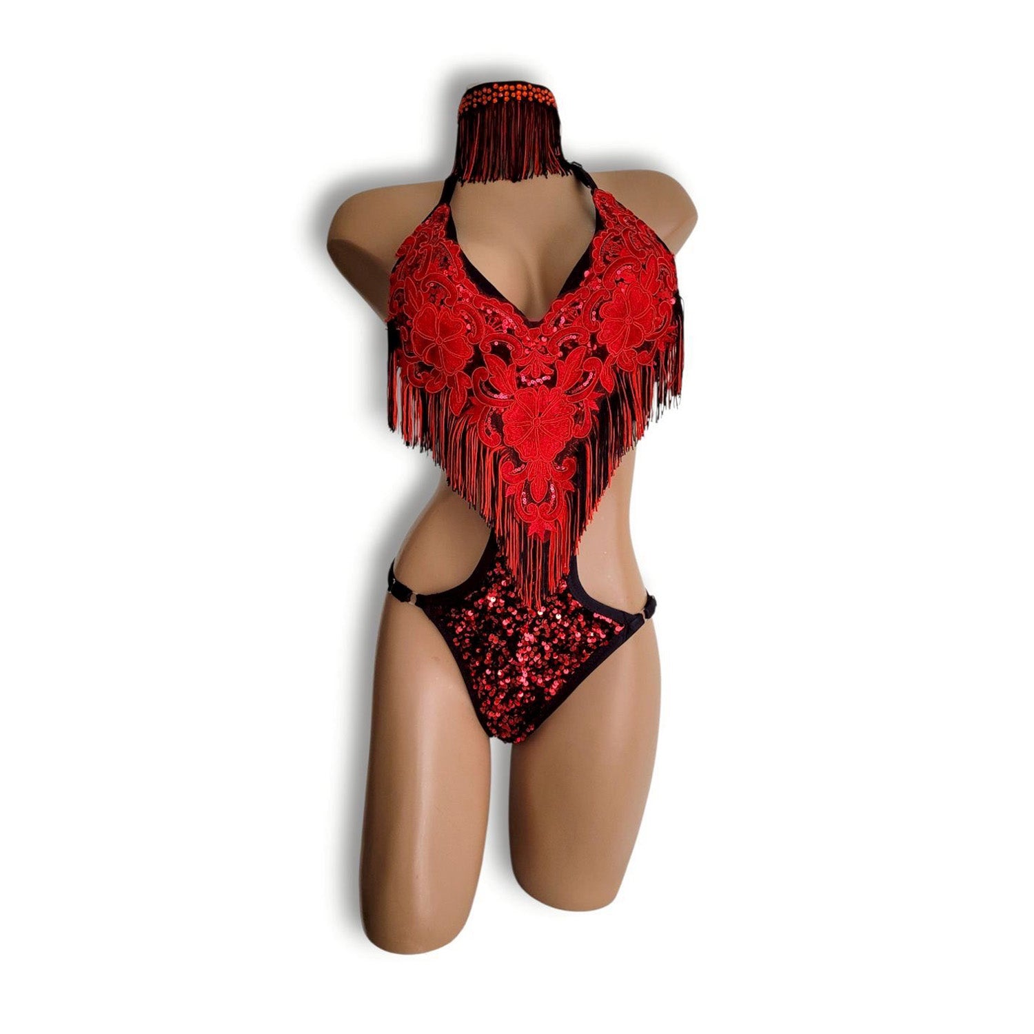 深みのある黒ベロアに、鮮やかな赤スパンコールを贅沢にあしらった、存在感あふれるテディとチョーカーのセットです。ベースには柔らかく肌なじみの良いレッドラッシュ生地を使用し、見た目の華やかさだけでなく、長時間の着用でも快適な着心地を実現しました。ボディを彩るモチーフは立体感と高級感を演出し、赤と黒のコントラストが印象的なフリンジが動きに合わせて揺れ、ステージ上でのパフォーマンスをよりドラマチックに引き立てます。
