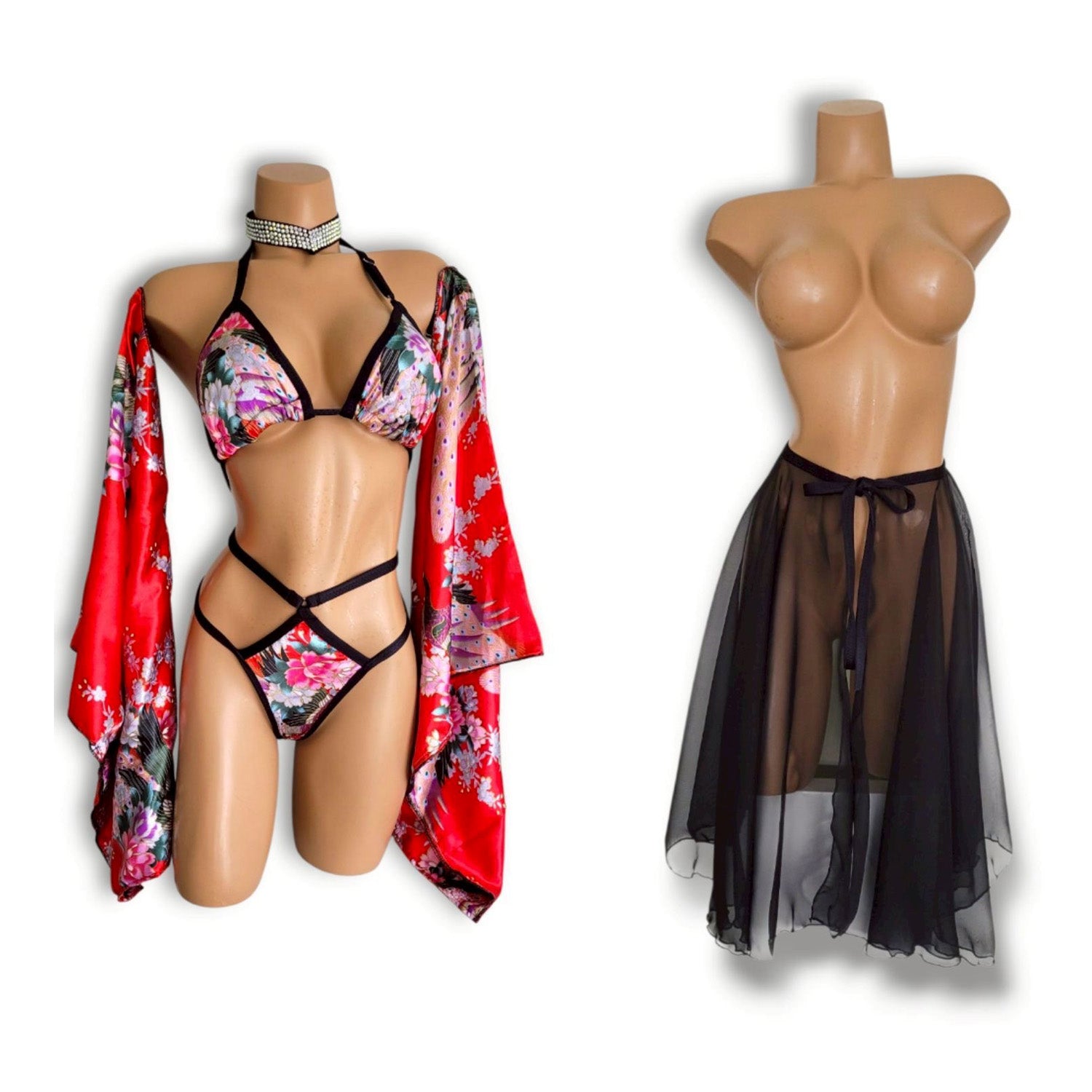 艶やかな赤のサテン地に和柄をあしらい、黒のアクセントで引き締めた、目を奪うような存在感のスカートセット。艶と品のある赤が放つ華やかさと、モダンな黒のコントラストが絶妙にマッチした、和洋折衷の魅力をまとった一着です。