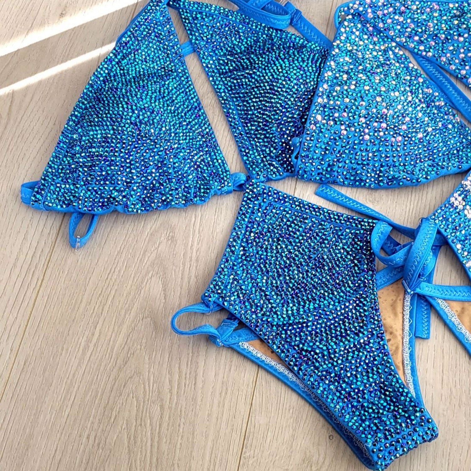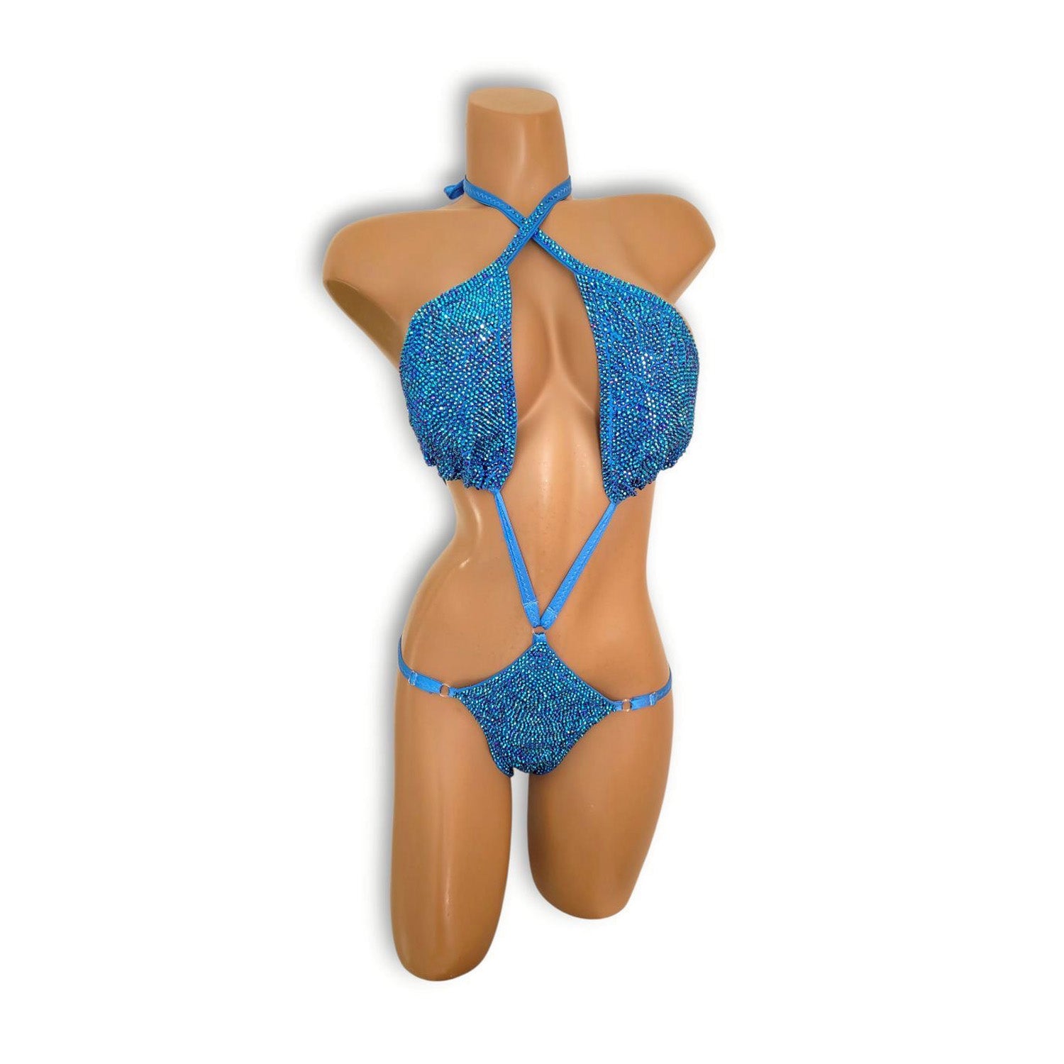 美しい青のストレッチ生地に、隙間なく敷き詰められたストーンが圧倒的な輝きを放つ、最高にセクシーでゴージャスなテディです。ステージライトを受けるたびにストーンが強く反射し、動きの一瞬一瞬まで美しく強調。登場した瞬間から観客の視線を引き寄せ、主役としての存在感を確立します。ボディラインにしなやかにフィットするストレッチ素材を使用しており、女性らしい曲線を際立たせながらも動きやすさを確保。