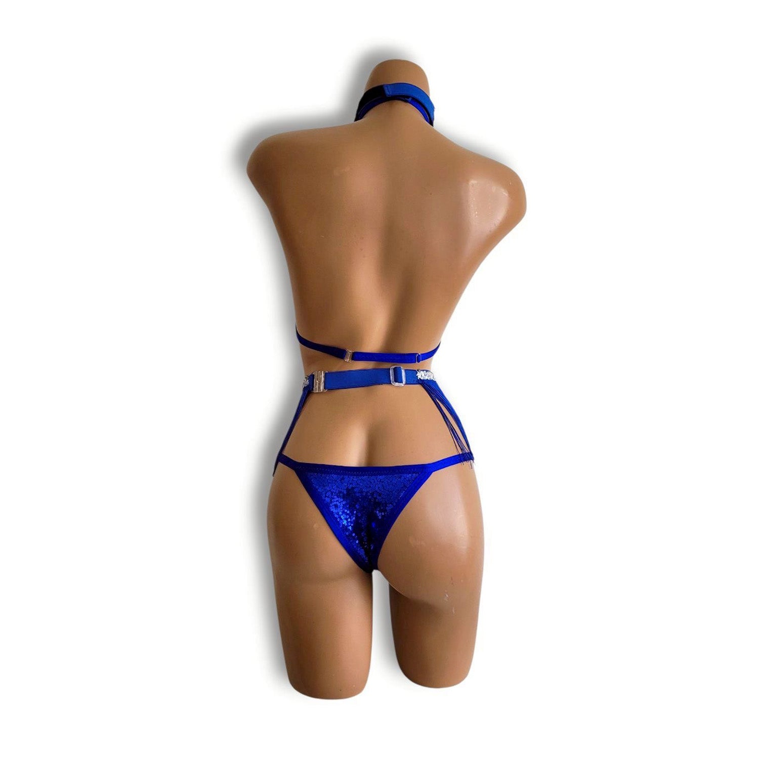 ステージに立った瞬間、クールで印象的な輝きを放つ、ハーフバック仕様のハイウエストビキニです。鮮やかなブルーのスパンコールを贅沢に使用し、照明を受けるたびにきらめく存在感を演出。動きに合わせて美しく揺れるフリンジが、パフォーマンス全体をよりダイナミックに見せてくれます。ハーフバックデザインとハイウエストのシルエットが、スタイルアップ効果と大胆さを両立し、ステージ映えをしっかりと叶えます。