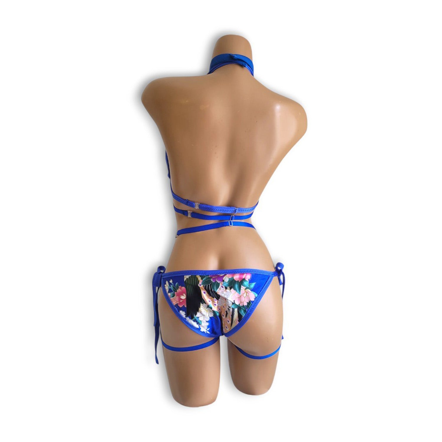 鮮やかなブルーのサテンが目を引く、和とモードを融合させたセパレートハーネス付きビキニセット。ビジュー付きセパレートハーネスと、和柄ビキニとの絶妙なバランスが魅力の、他にはない存在感を放つ特別なアイテムです。日本の伝統美を感じさせる和柄デザインはクラシカルな雰囲気を持ちながらも、洗練されたシルエットと組み合わせることで、どこか現代的でセクシーな印象に。