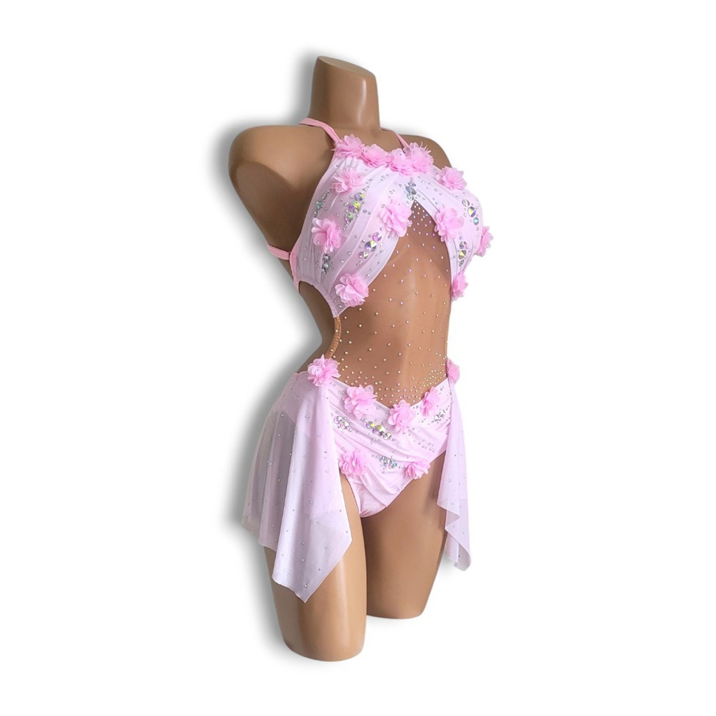 可愛い桃色が春を呼ぶコスチューム。 薄いピンクのストレッチ生地にお花モチーフやストーンが散りばめられ、動くたびにひらりと揺れるスカートが美しさを際立たせる特別なデザイン。